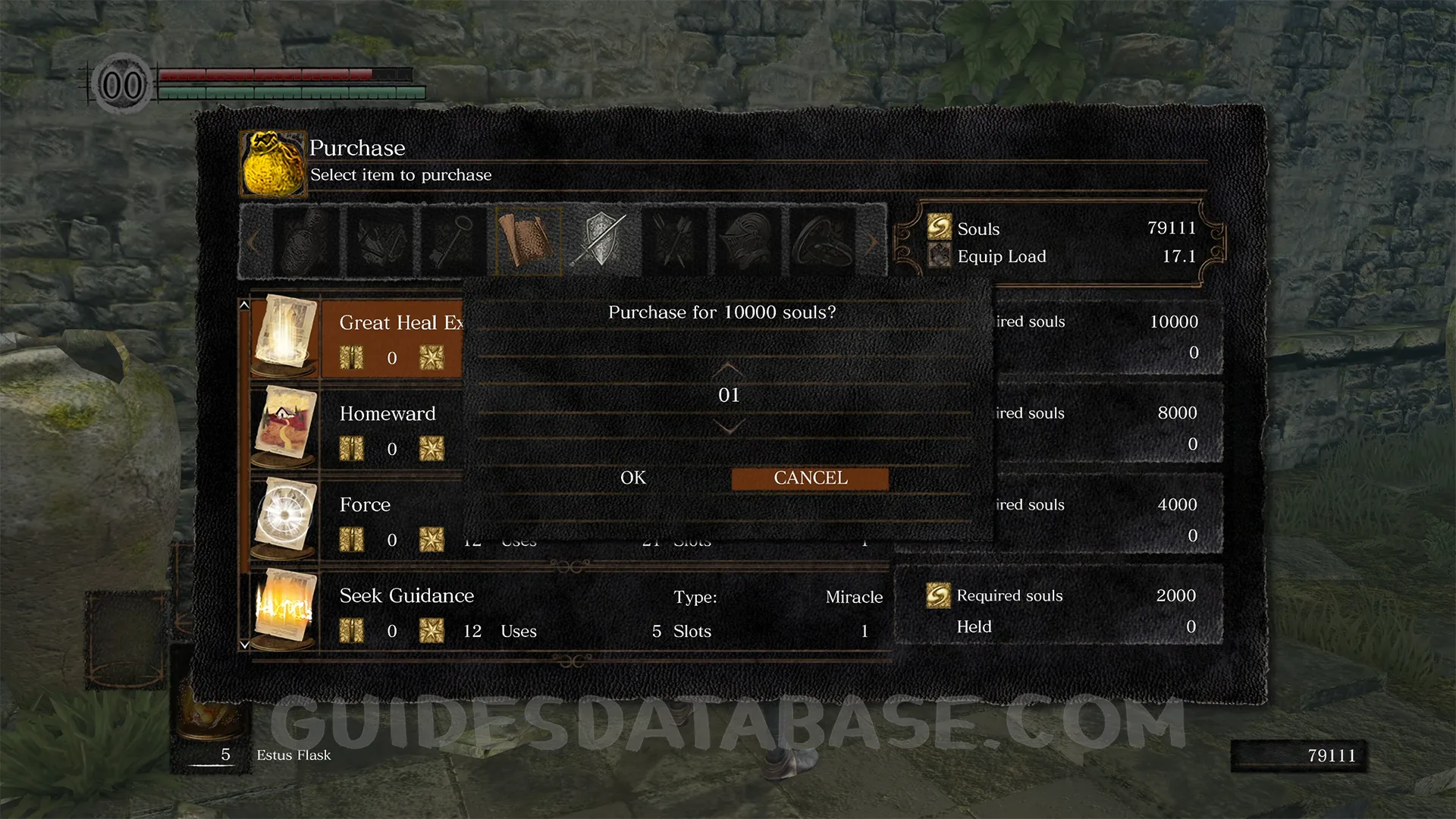 Petrus of Thorolund is the first miracle vendor you will encounter, found among the ruins at Firelink Shrine up the stairs toward the Undead Parish elevator. He sells basic miracles and is accessible very early in the game. To unlock his shop, speak to him several times until he agrees to sell to you. If you started as a Knight or Cleric he will sell without additional conditions, otherwise you may need to join his covenant, the Way of White, which costs nothing and has no negative consequences. From Petrus you can purchase Heal (1,000 souls, 12 Faith), Force (1,000 souls, 12 Faith), Seek Guidance (500 souls, 12 Faith), Homeward (1,000 souls, 18 Faith), and Great Heal Excerpt (2,000 souls, 14 Faith). These same miracles are also sold by Rhea of Thorolund later in the game, so buying from Petrus early simply saves you the trouble of waiting. Buy everything from Petrus as soon as possible, since his questline can complicate things later.
