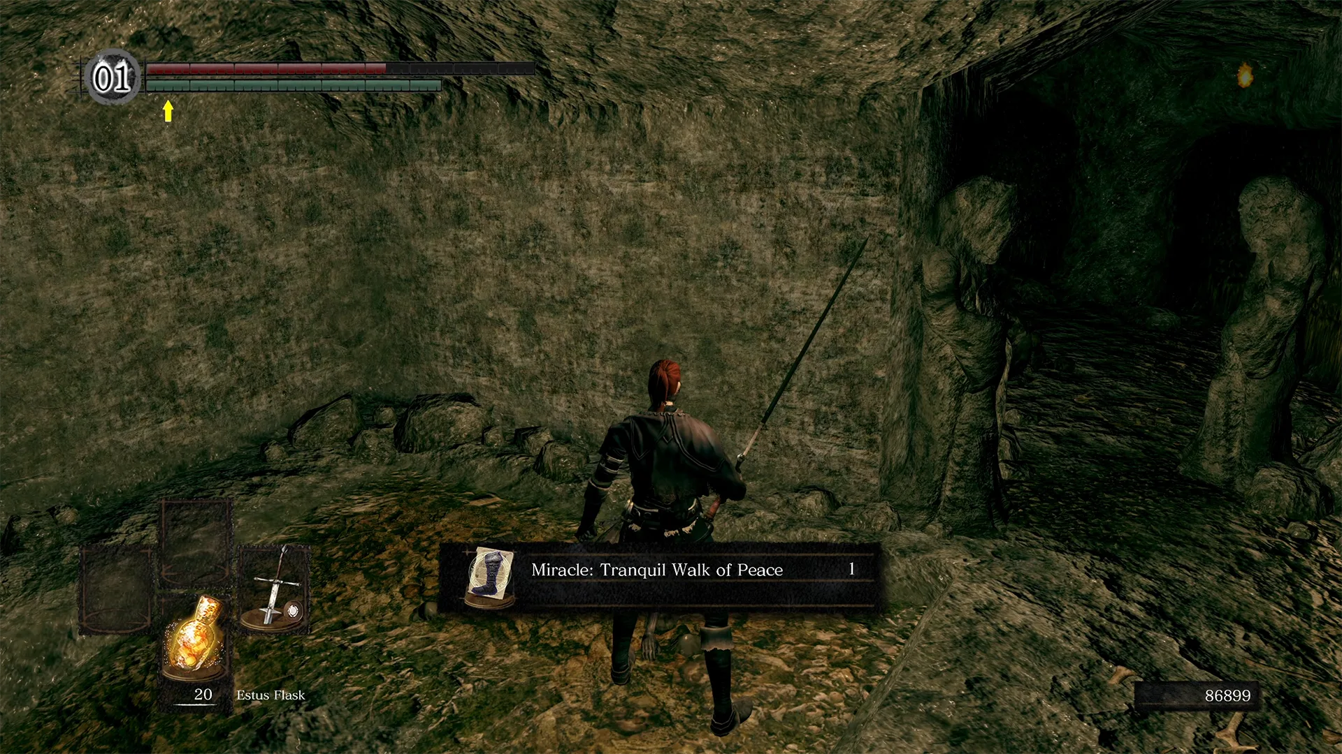 Tranquil Walk of Peace is found in the Catacombs, on a corpse in a hidden area. From the second bonfire in the Catacombs, cross the bridge and go through the area with a breakable wall section. Drop to the lower level and continue through the crypt. About halfway along the corridor you will find another breakable wall. Follow the slope up, continue along the path, and take the ladder on the right. Pass the two spike-covered statues, then turn right to find the corpse holding this miracle.
