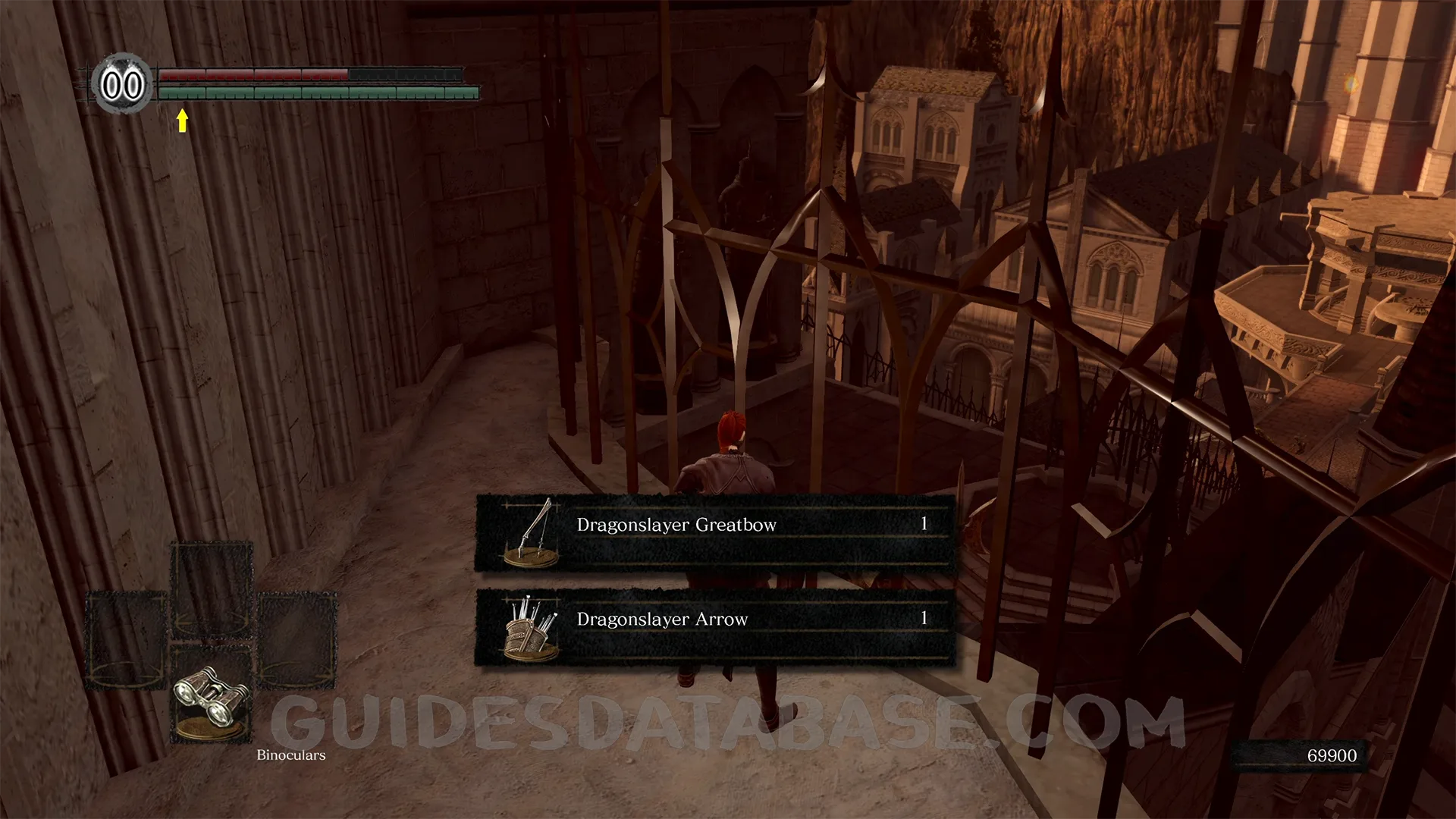 Dragonslayer Greatbow is found in Anor Londo, on a corpse on a small ledge above the main hall. Make your way to the top floor of the main hall near the Giant Blacksmith and find the cracked stained glass window. Roll through it and land carefully on the platform below to collect the bow from the corpse there.