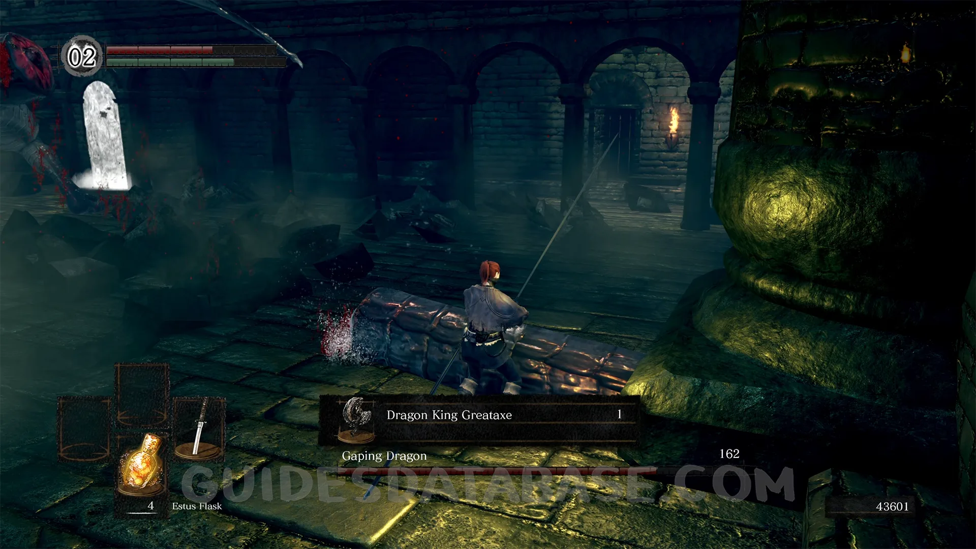 Dragon King Greataxe is obtained by cutting the tail of the Gaping Dragon in the Depths. The Gaping Dragon moves around the arena constantly, making tail access difficult. Stay patient and commit to tail attacks only. If you are about to kill the boss without severing the tail, let it kill you and attempt again.