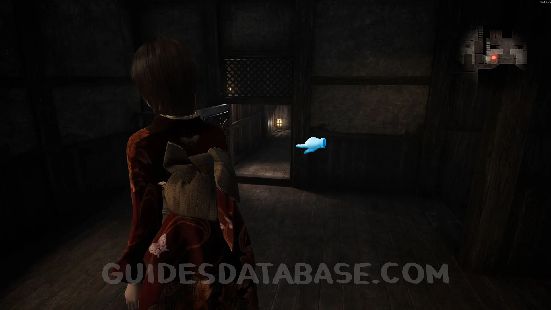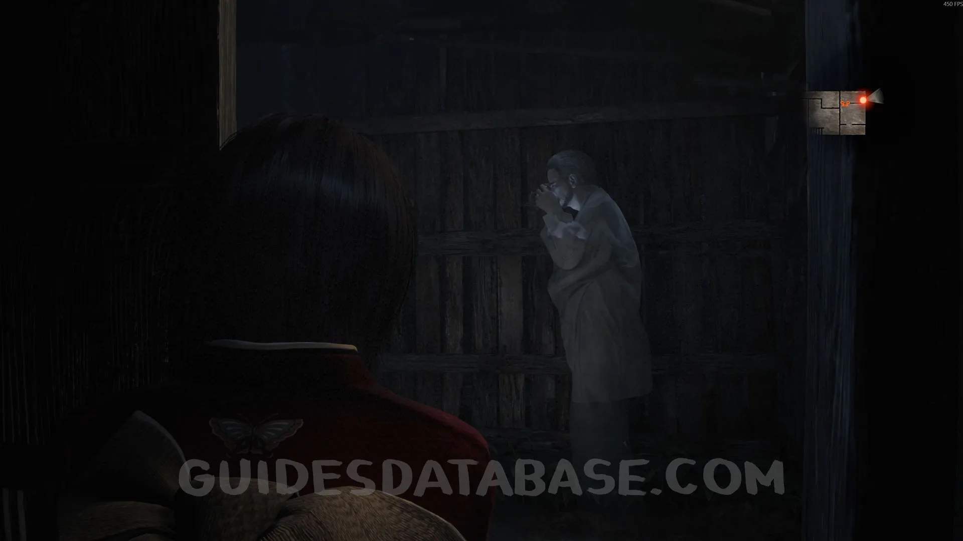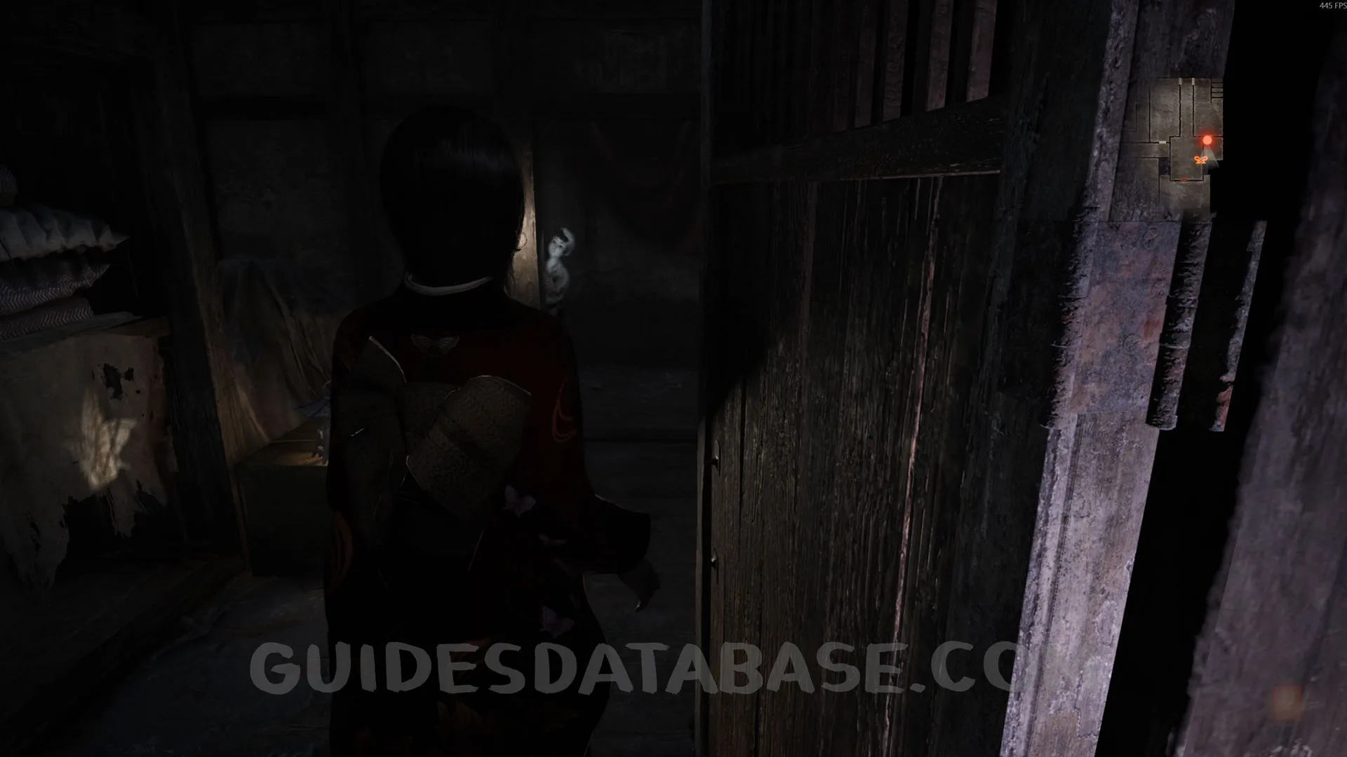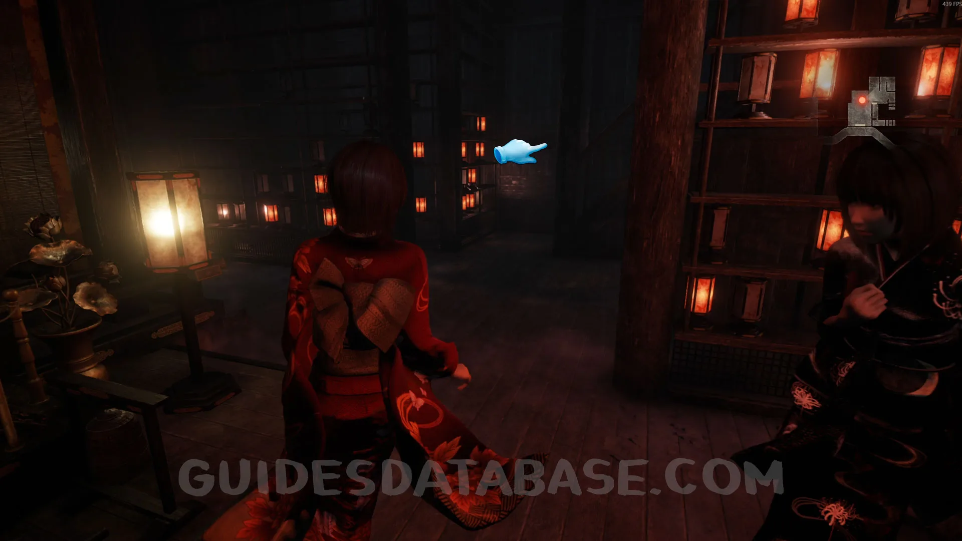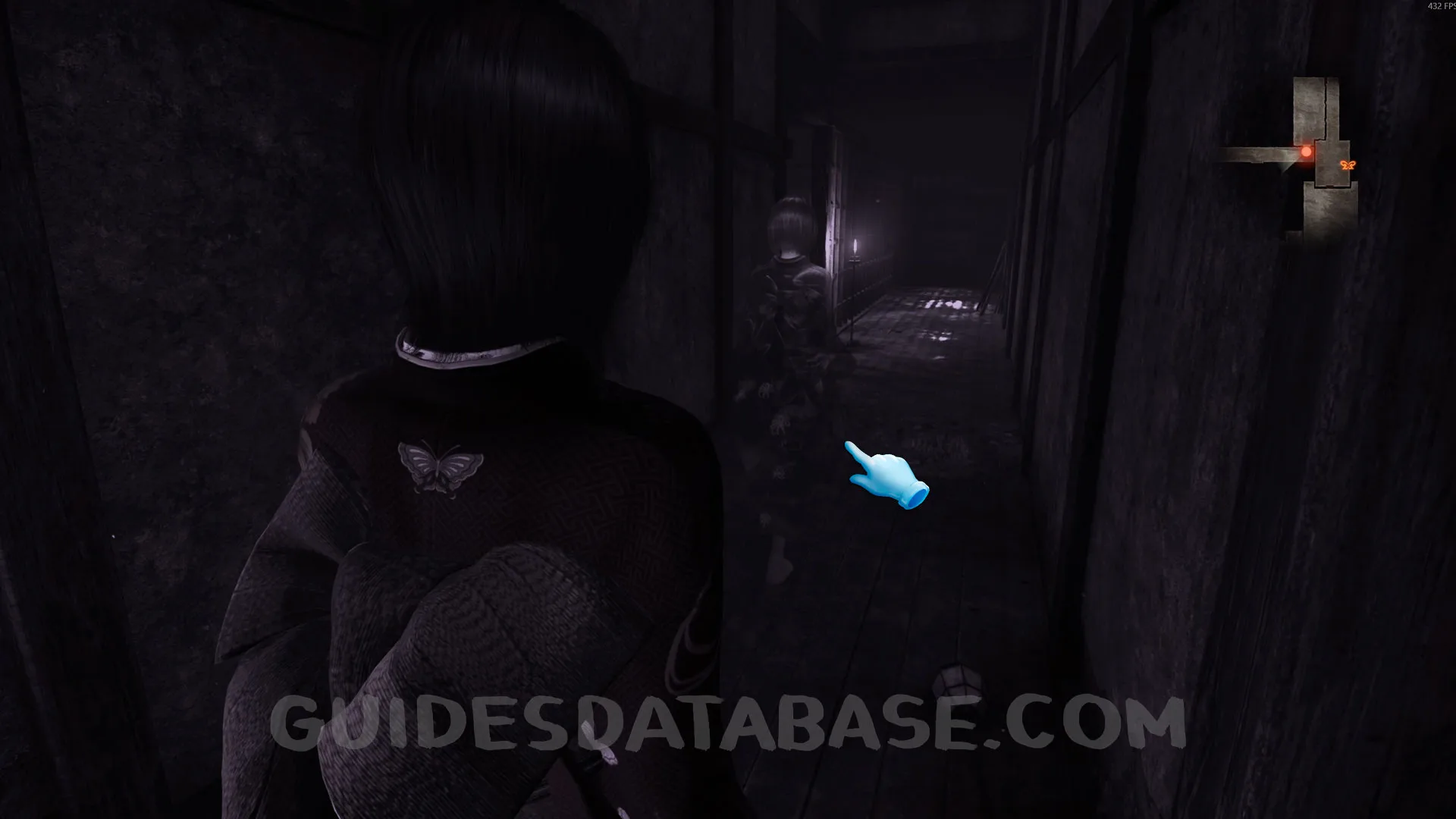 After picking up the Camera Obscura and interacting with the exit door to progress, Mayu will point her finger upward showing this specter on the second floor. Take a picture.