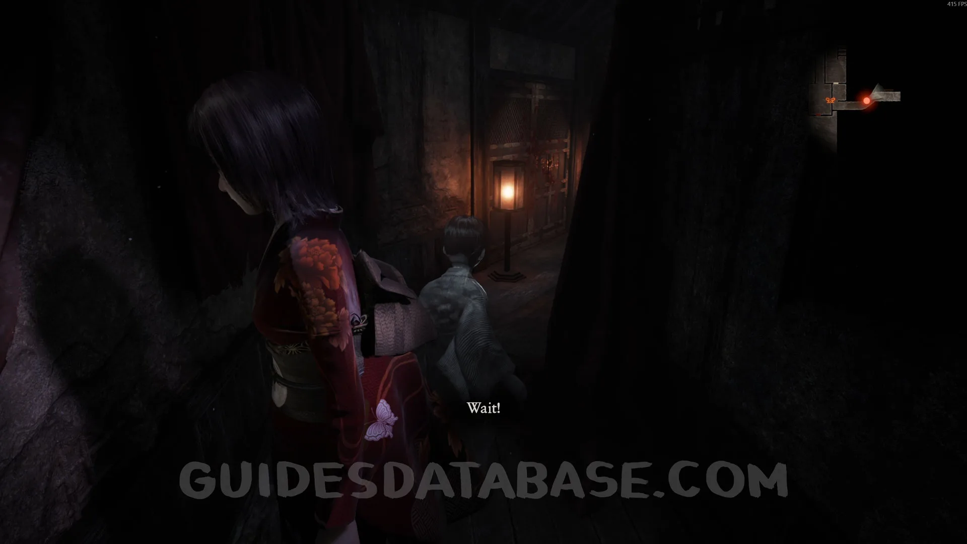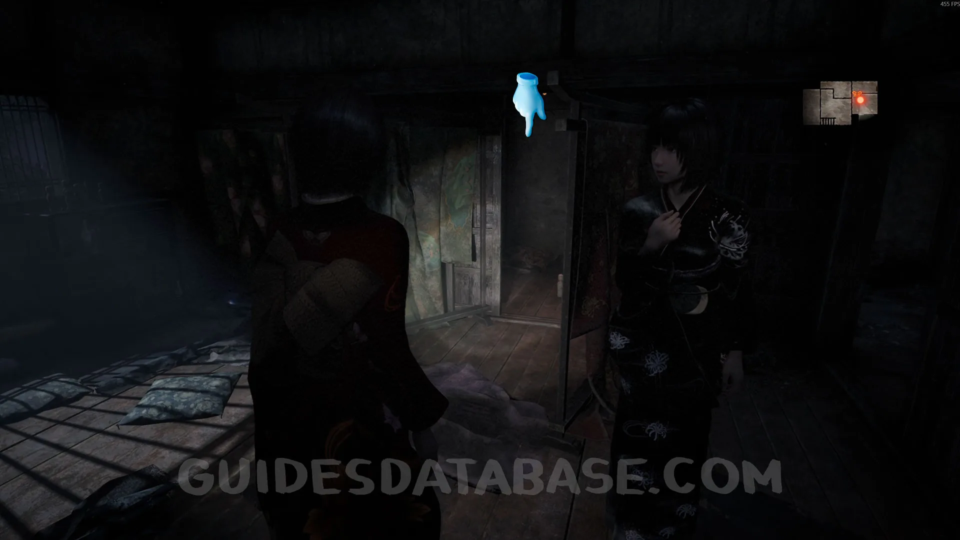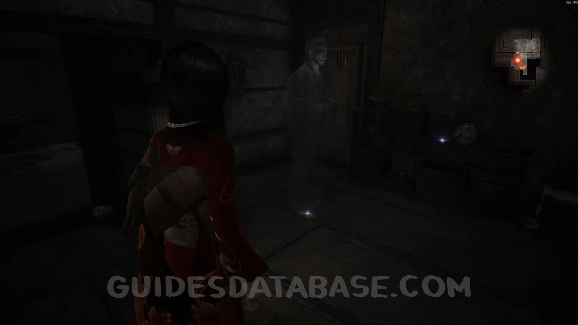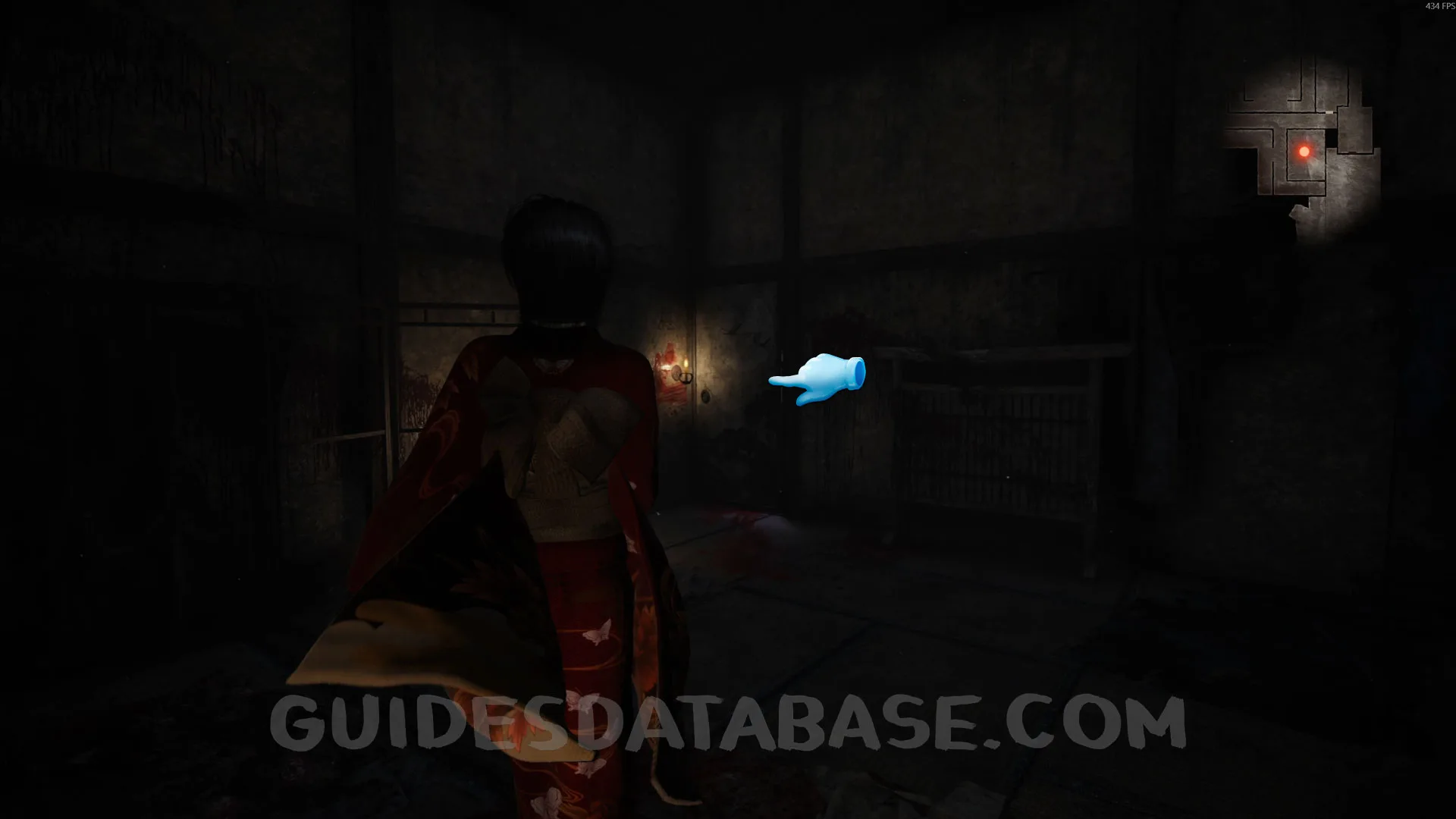 After picking up the Camera Obscura and interacting with the exit door to progress, Mayu will point her finger upward showing this specter on the second floor. Take a picture.