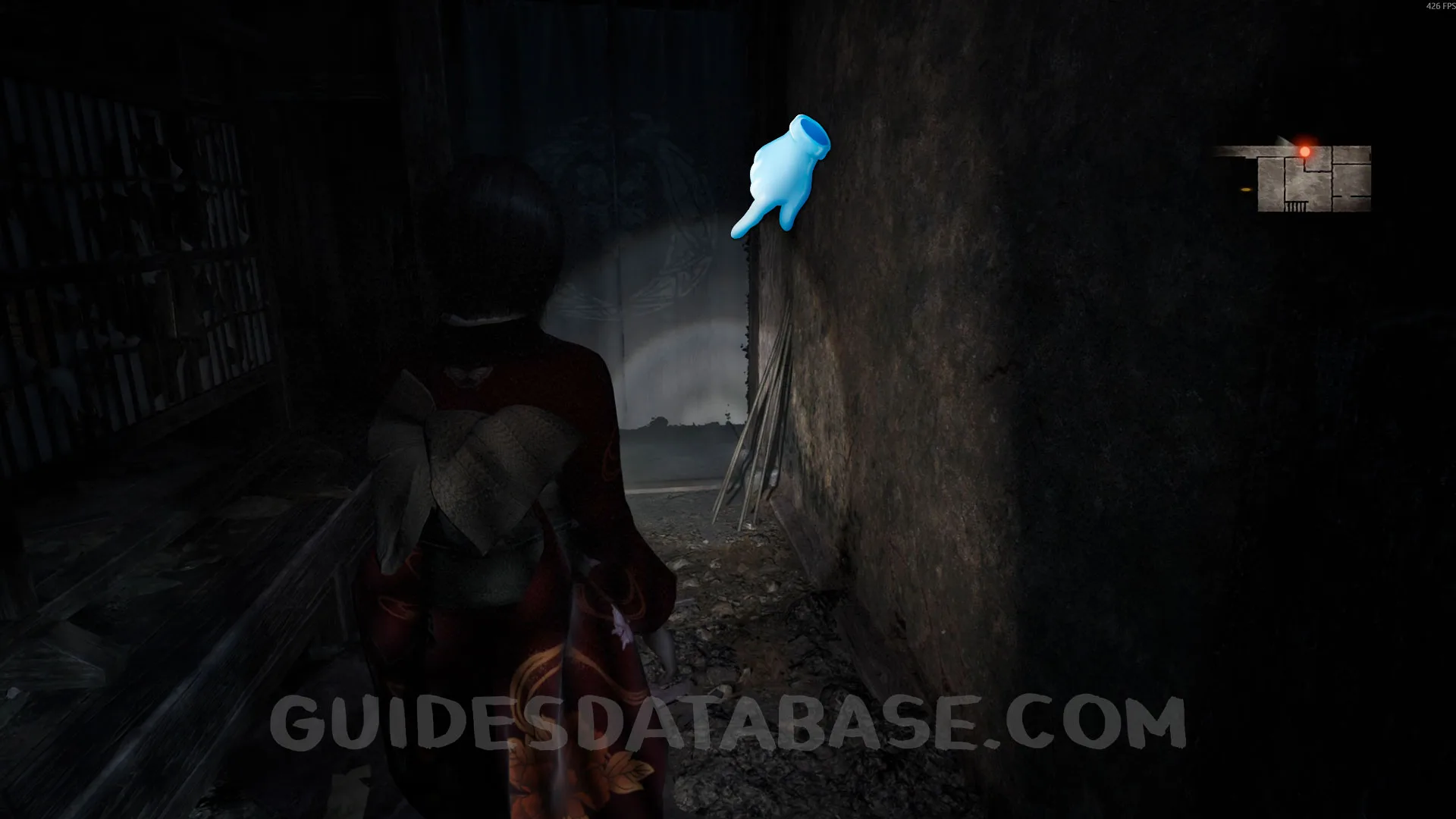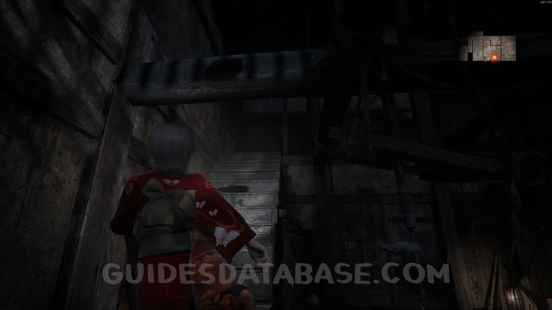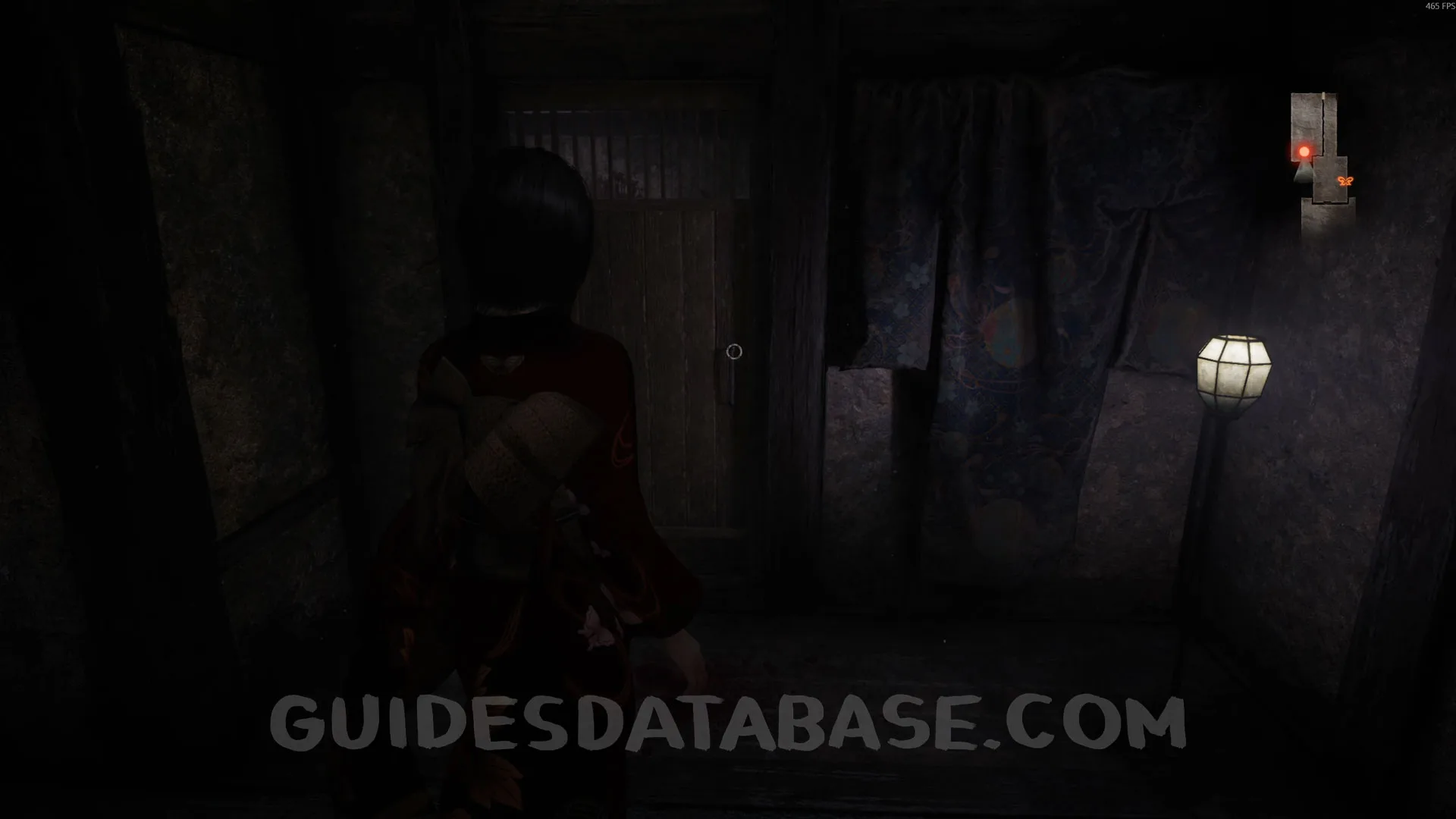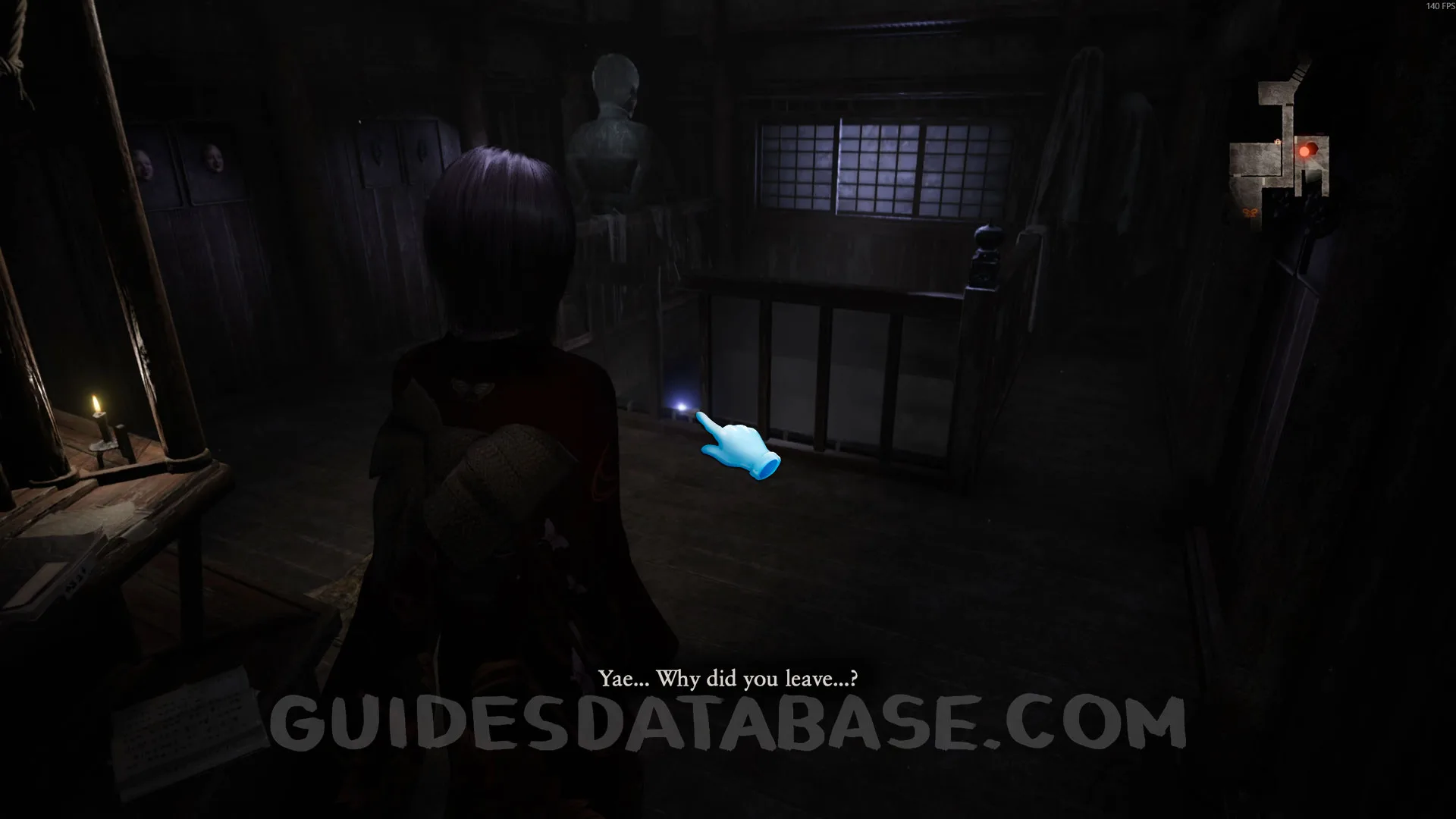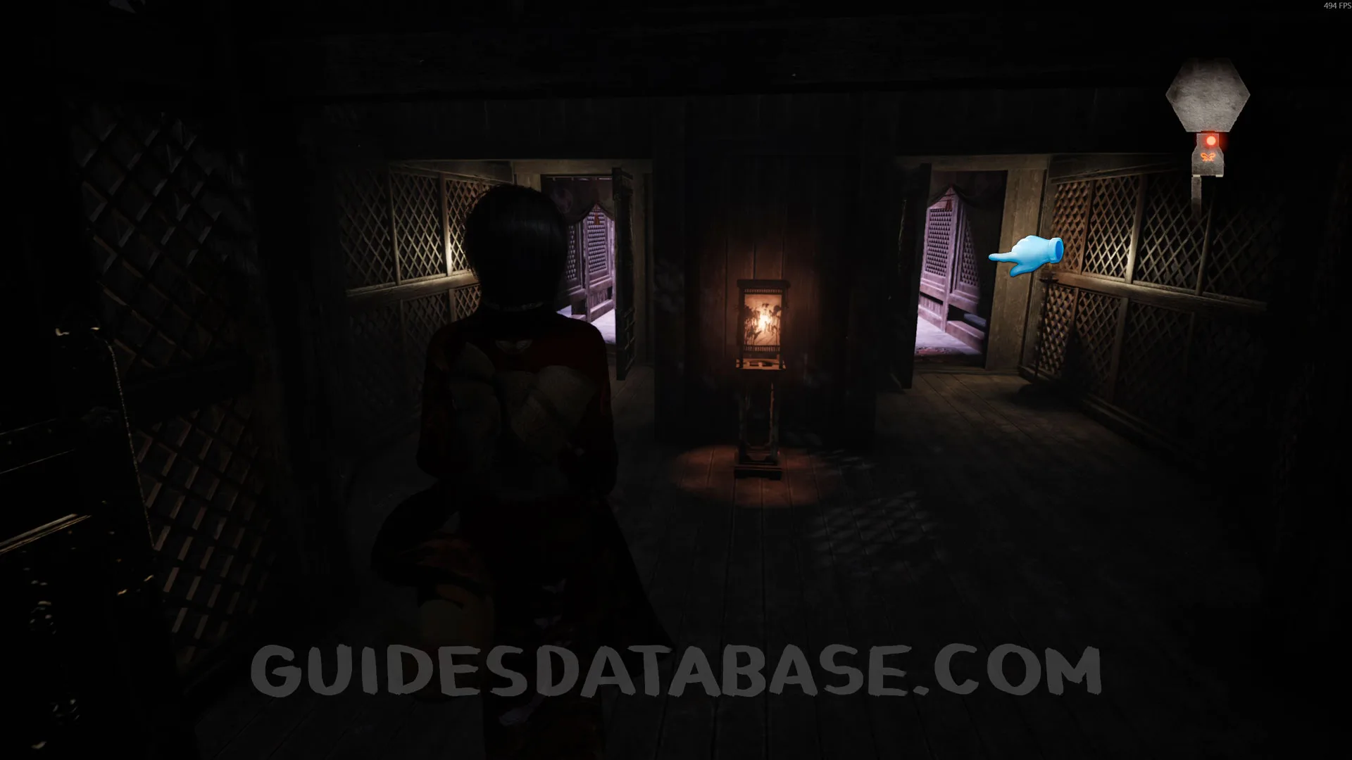 After picking up the Camera Obscura and interacting with the exit door to progress, Mayu will point her finger upward showing this specter on the second floor. Take a picture.