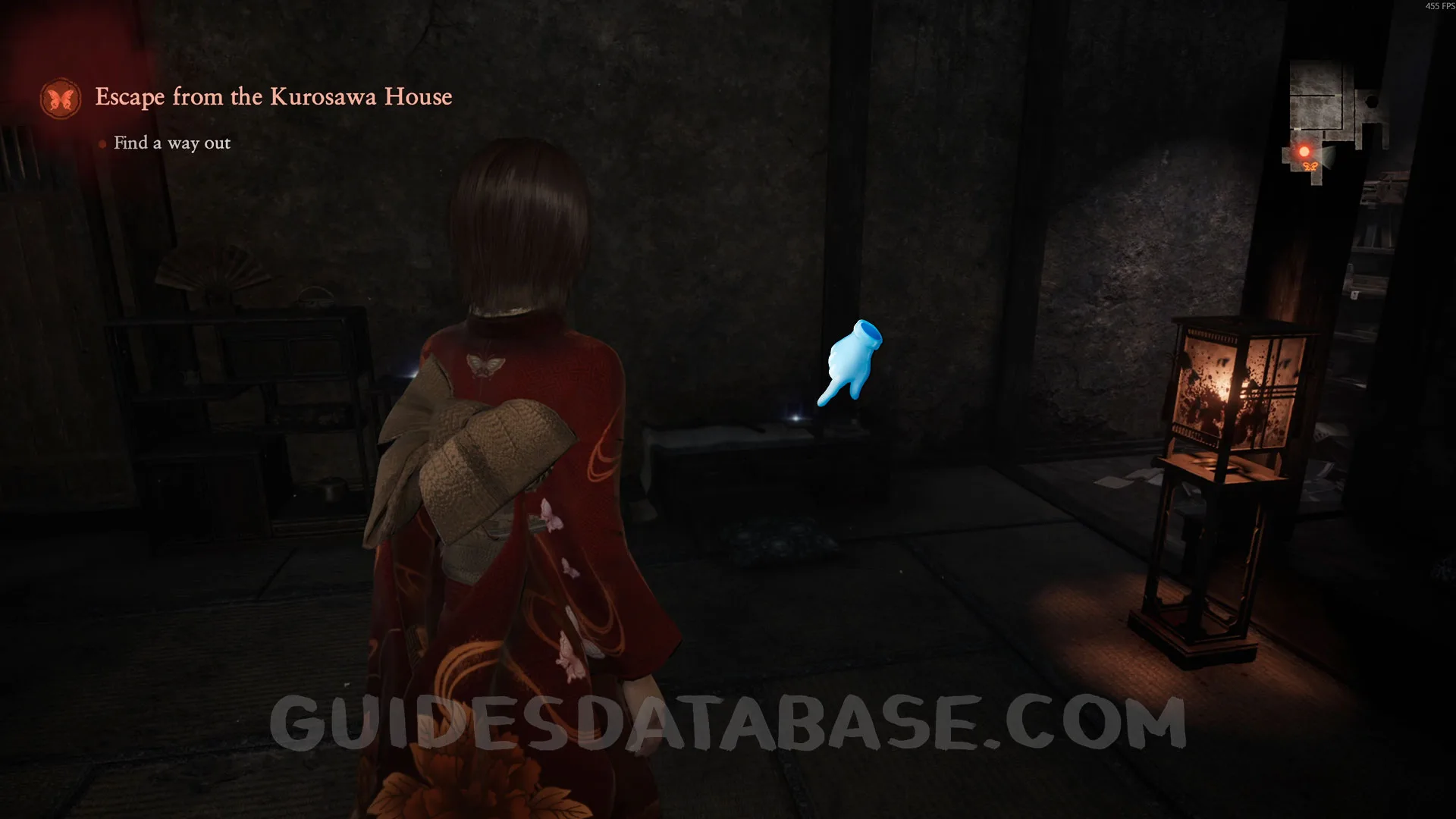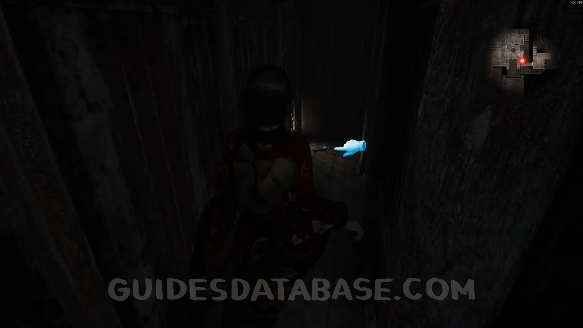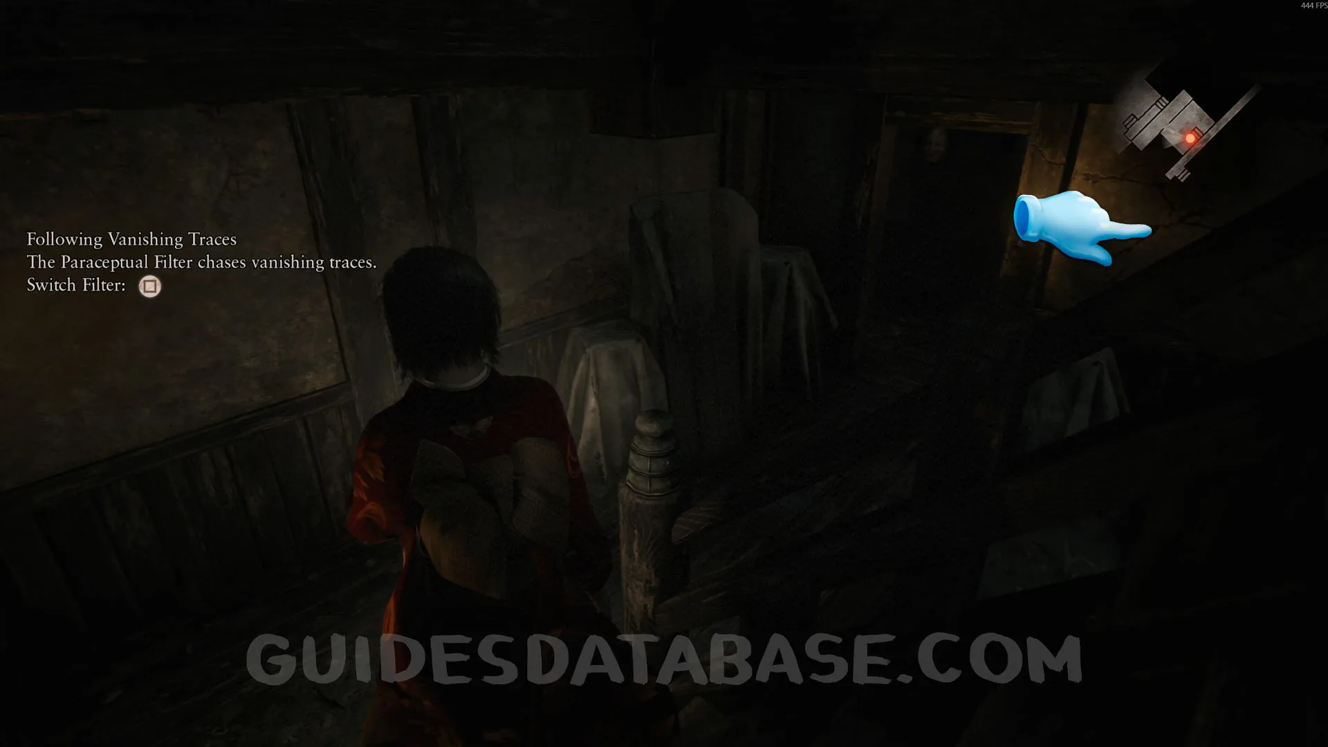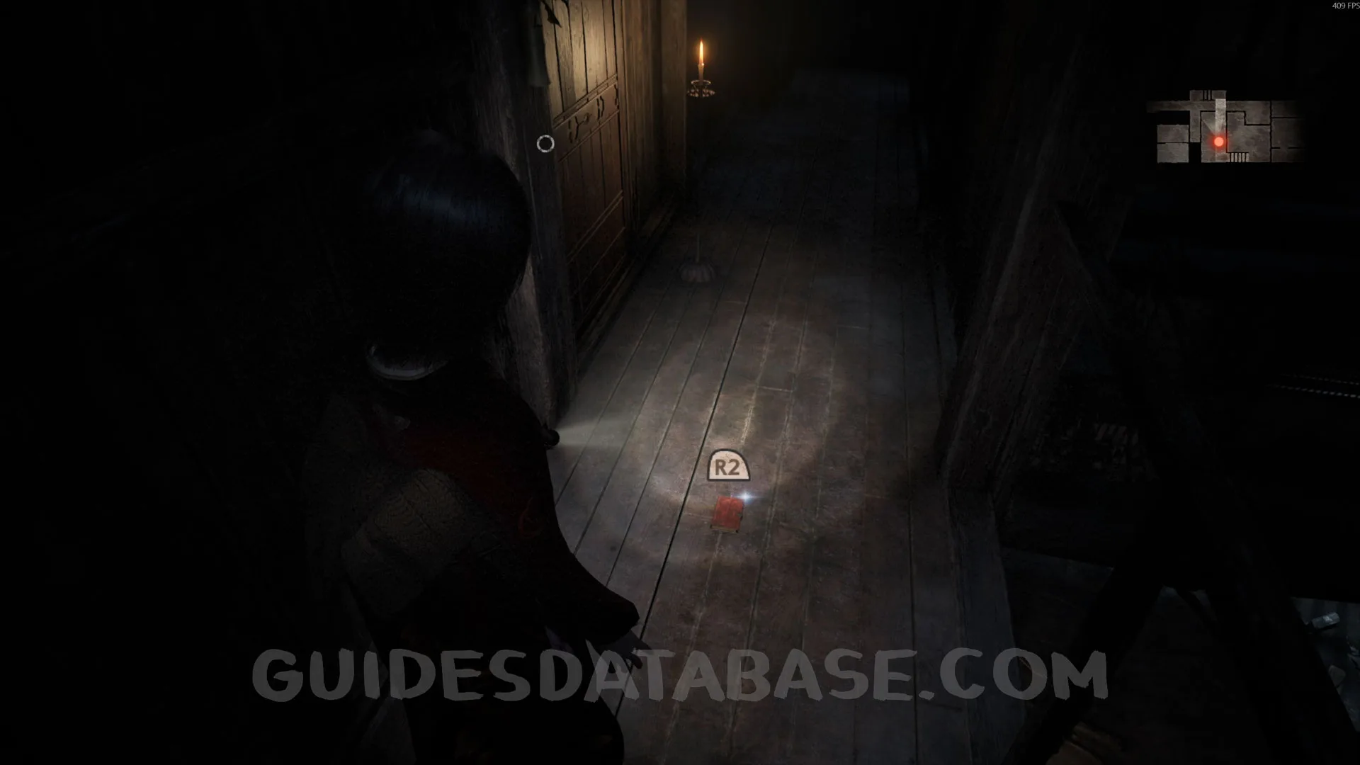 After picking up the Camera Obscura and interacting with the exit door to progress, Mayu will point her finger upward showing this specter on the second floor. Take a picture.