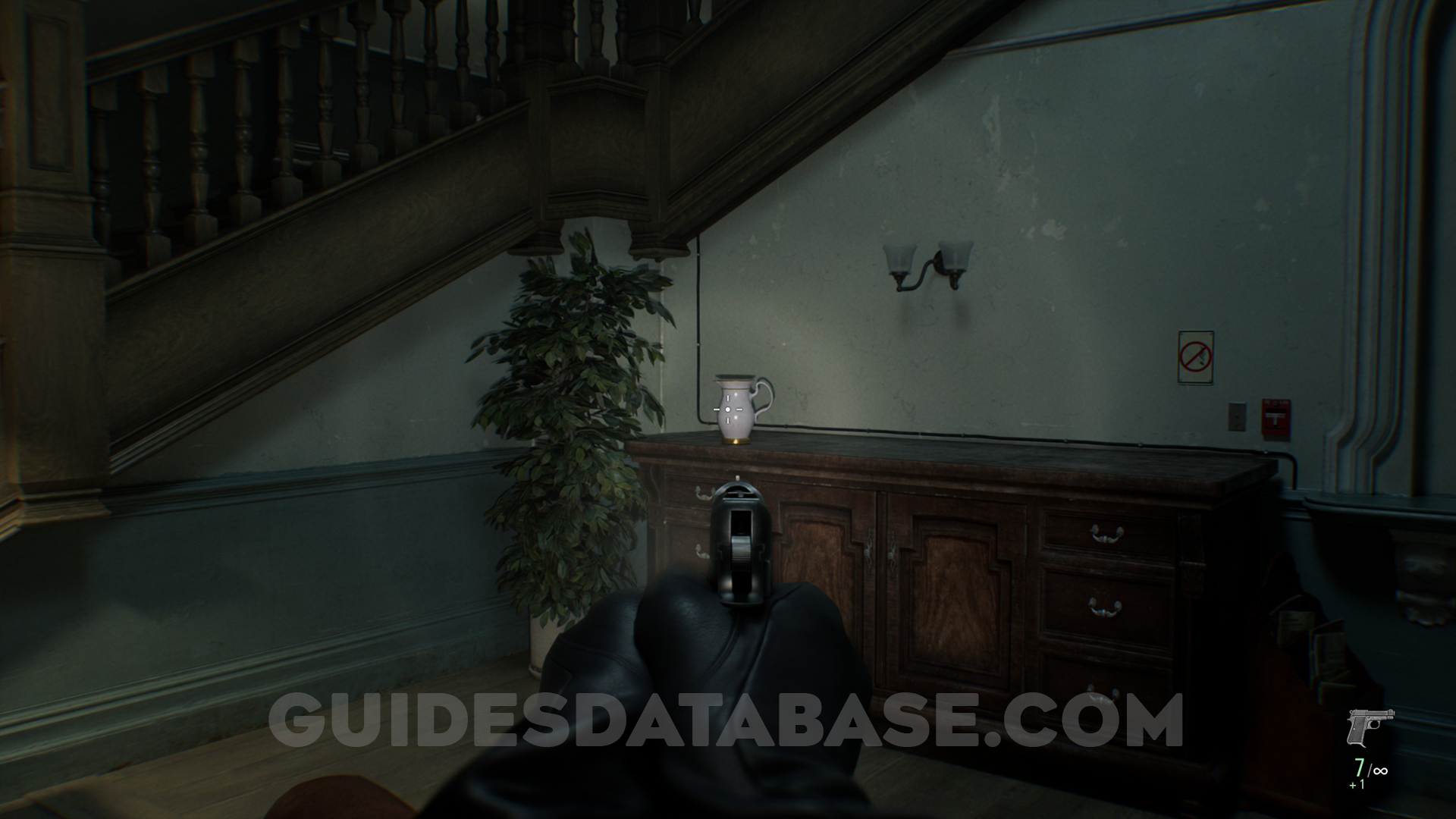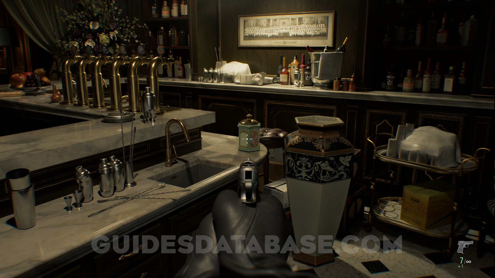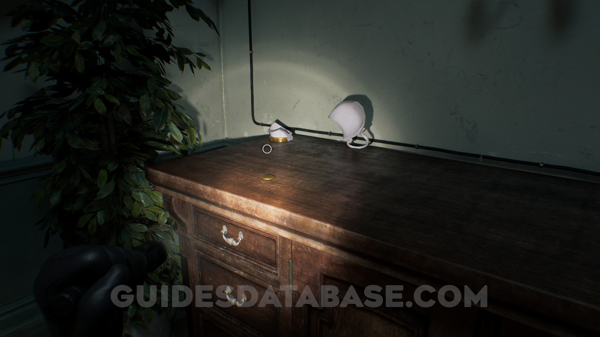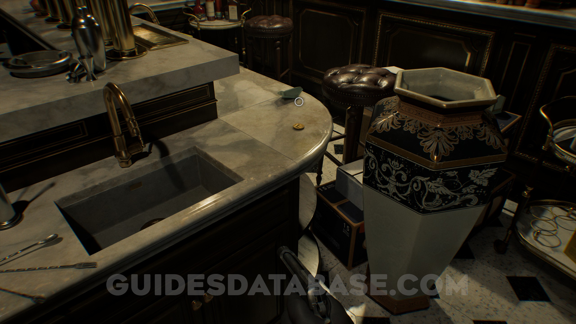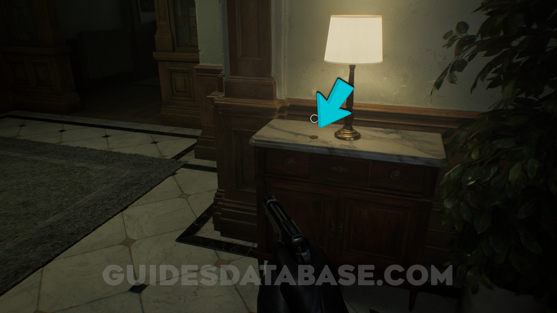 In the parlor, break the small vase on top of the counter to reveal this coin.