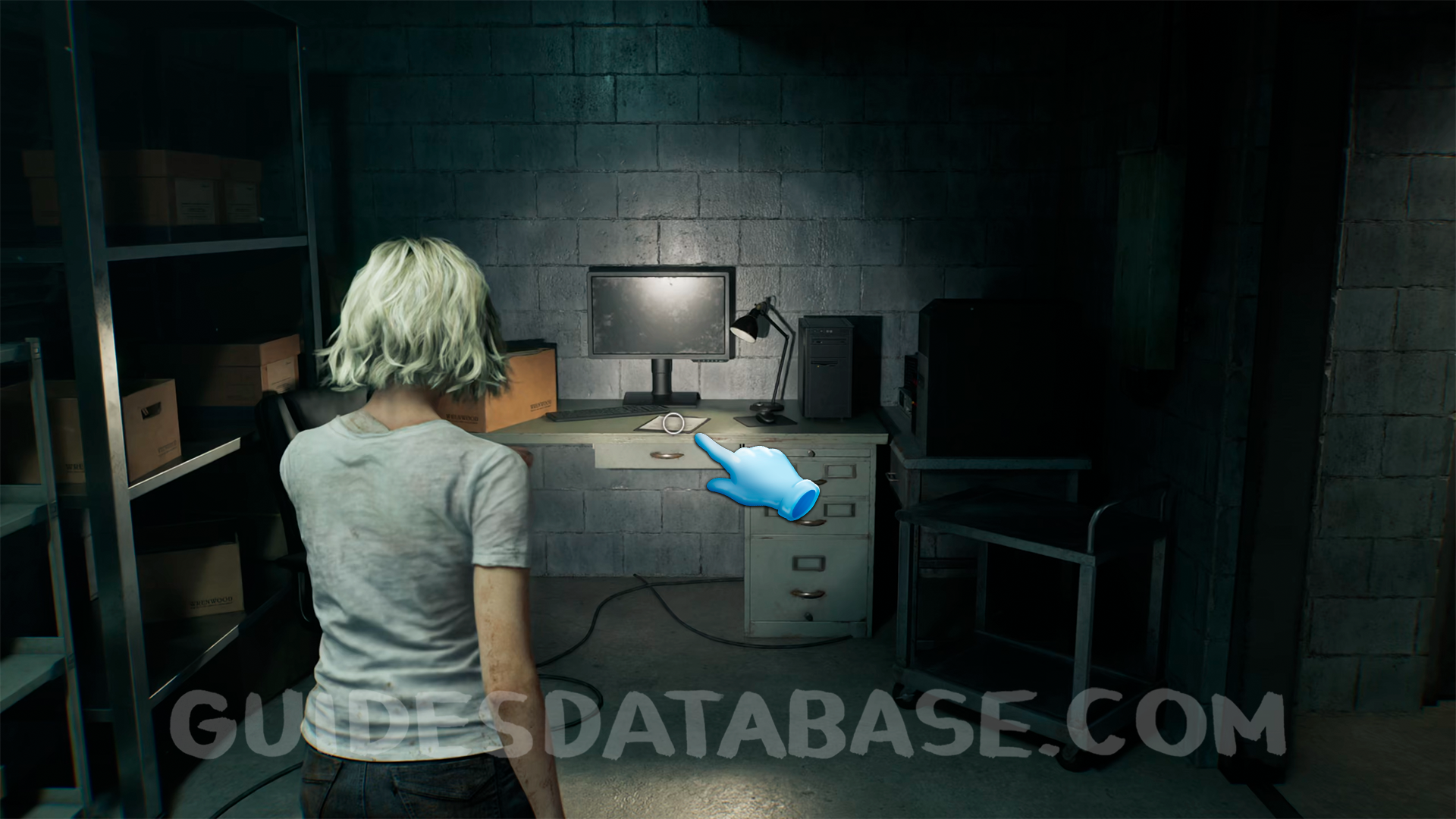 Head behind the reception desk and navigate the hallway leading into the backroom. Once there, open the blue drawer.