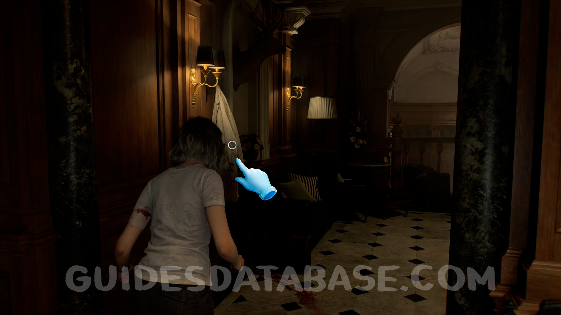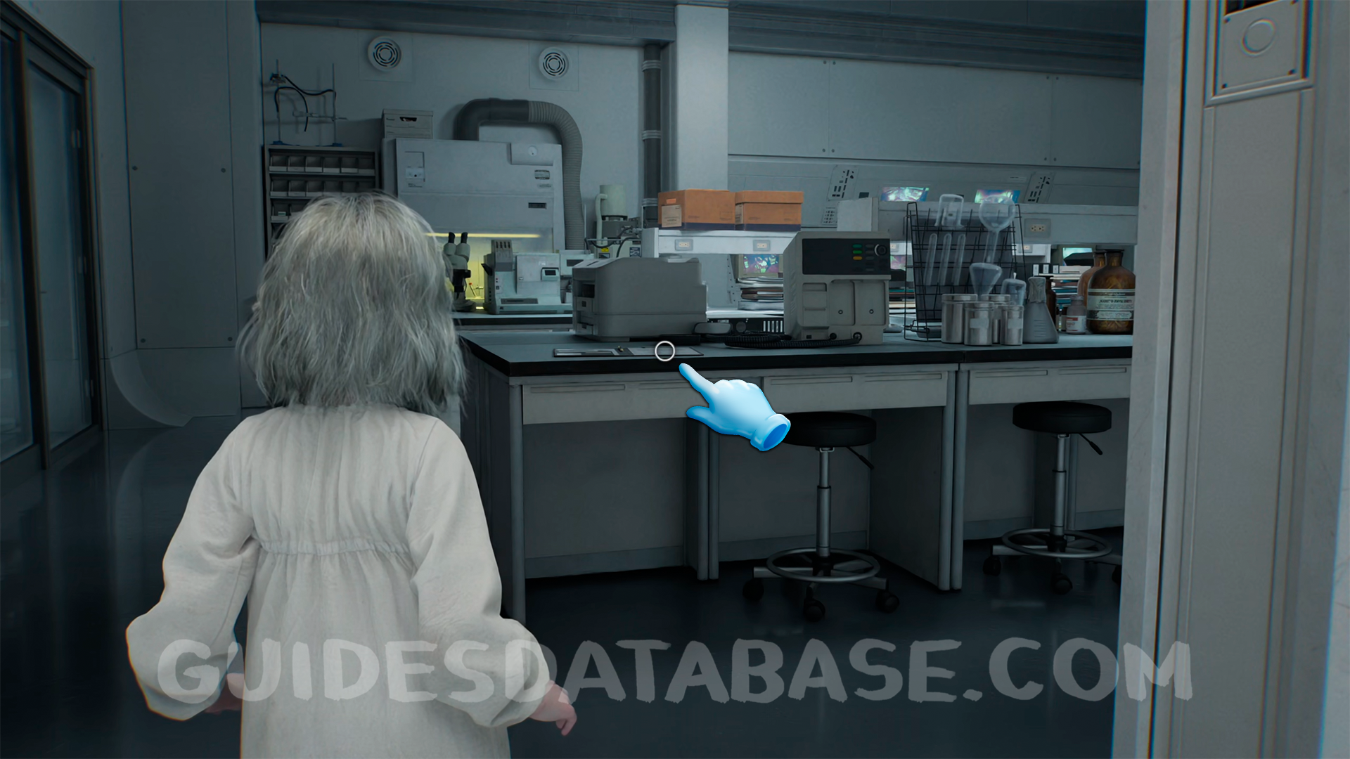 Gallery: After passing through the Bar & Lounge, continue down the corridor, take a left, and examine the white coat hanging on the wall.