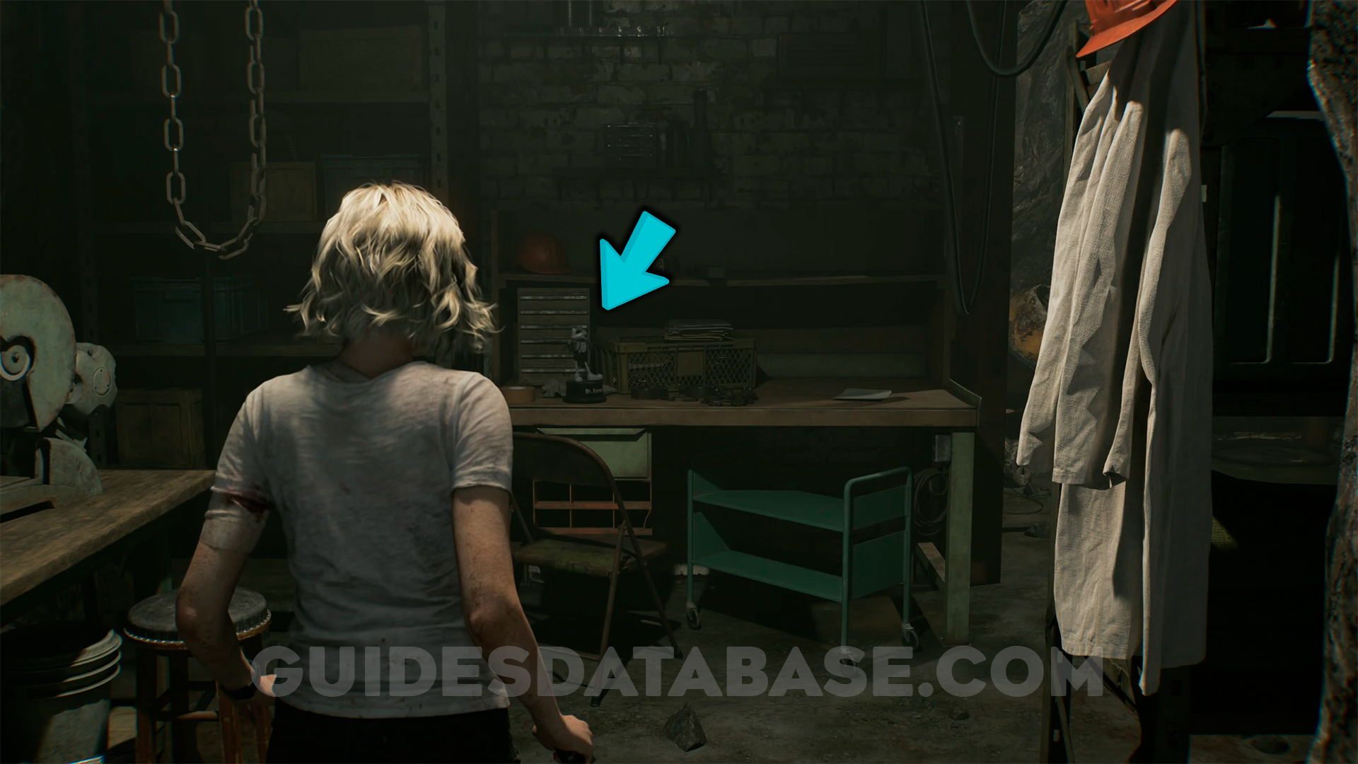 At the end of the Holding Cells corridor, inside the workshop room, on top of a workbench.