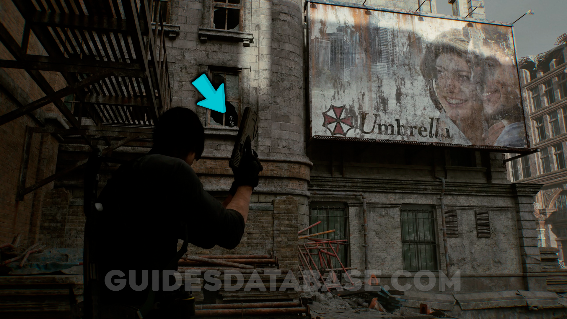 After the cutscene in Gun Shop Kendo, in a window next to an Umbrella banner.