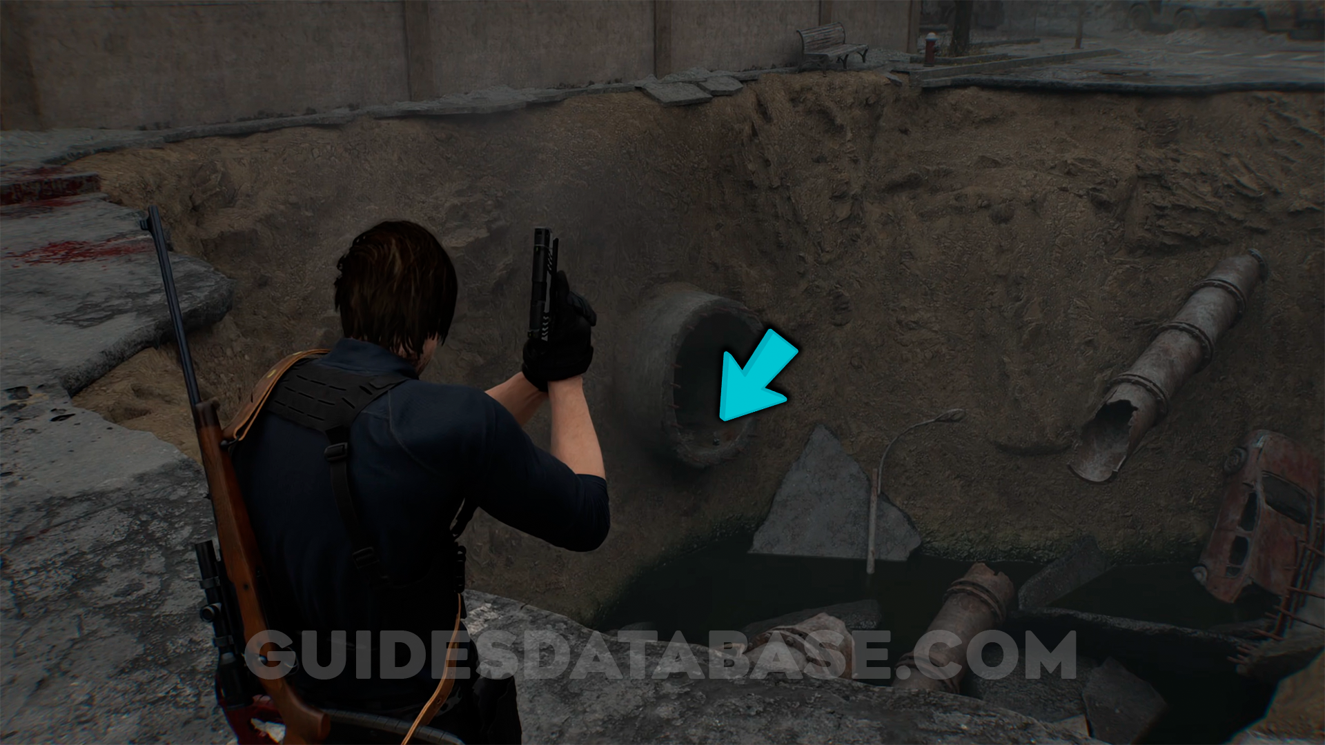 At the end of the main street, where you unlock a shortcut to the central camp, inside a pipe.
