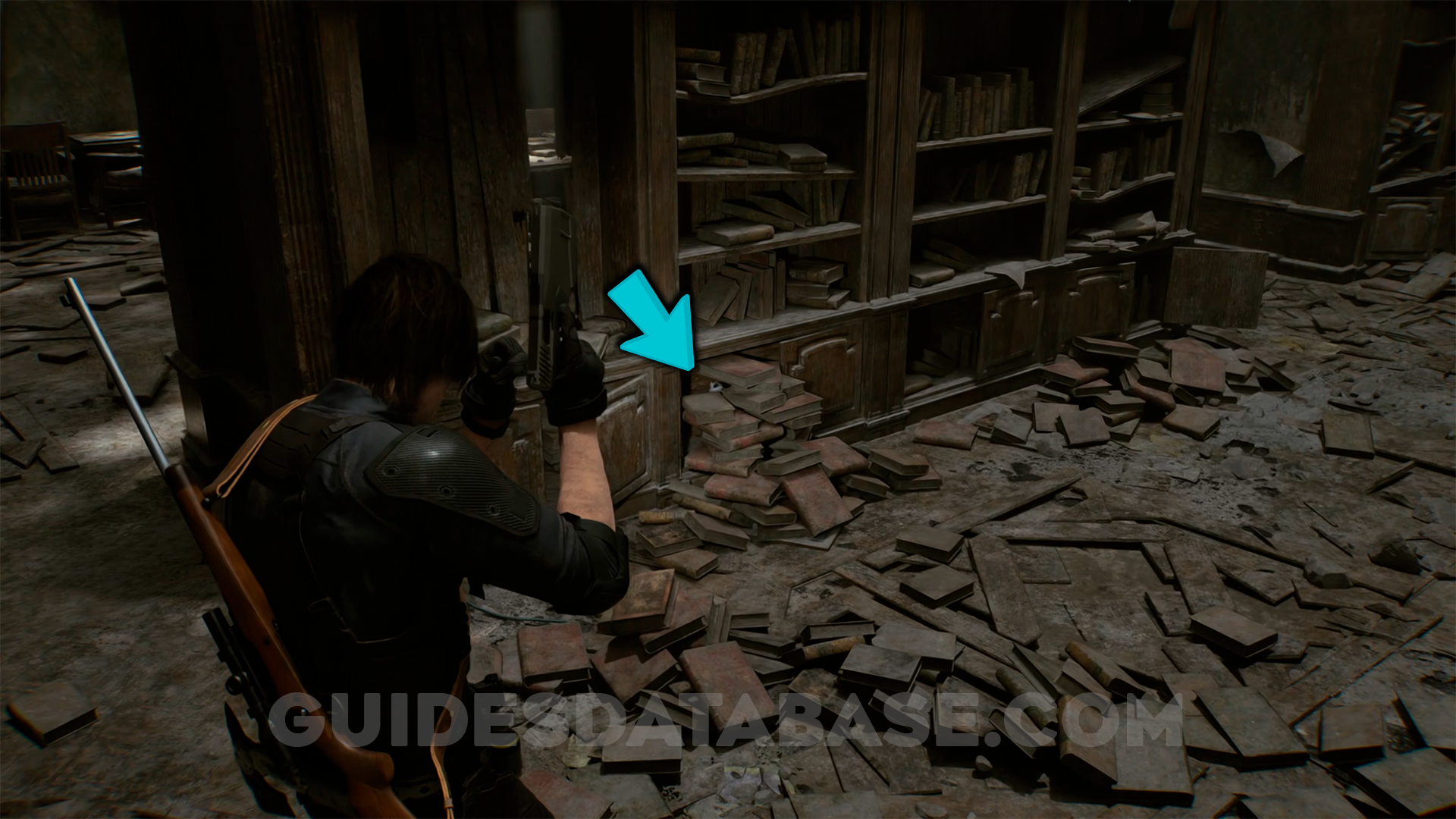 In the library, at the bottom of a bookshelf behind some books.