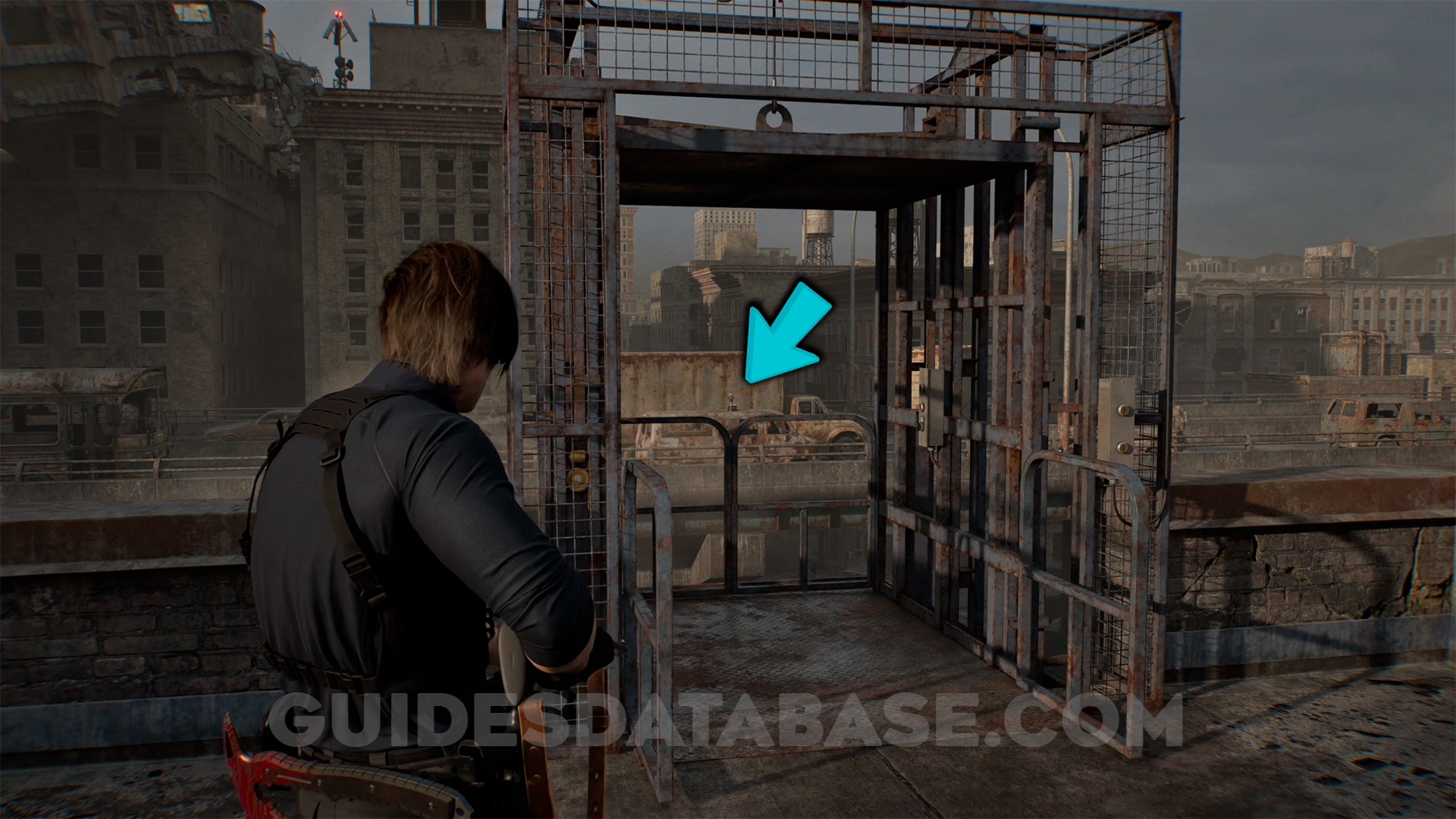 After using the zipline to reach the Willis Tower, on a shelf.