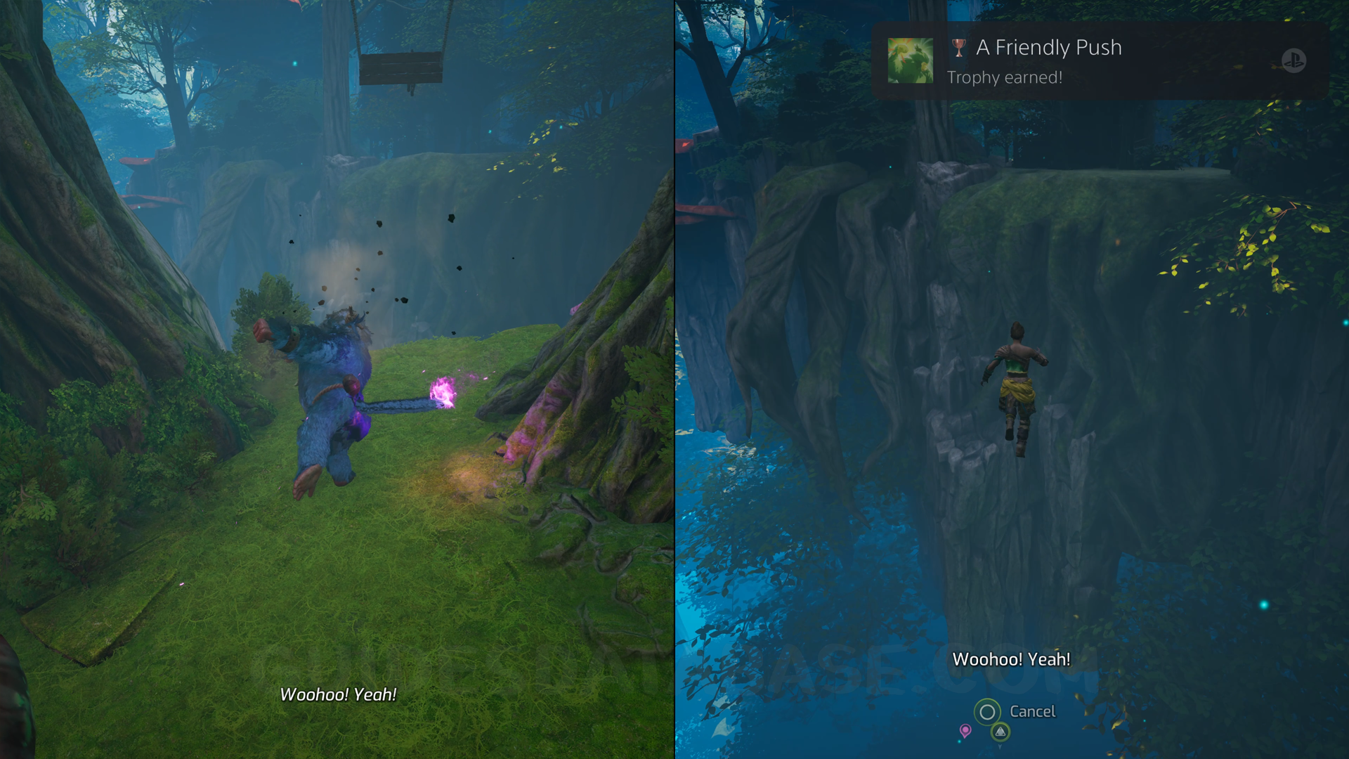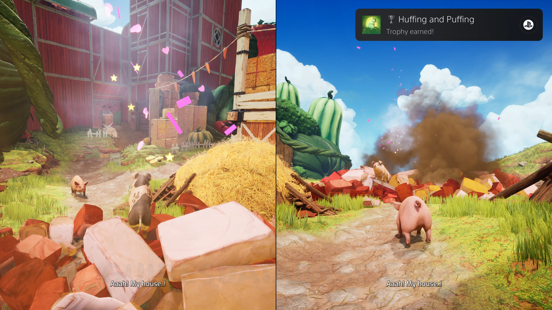 Right after the previous trophy, continue forward and after picking up the apples you’ll see a small house. Player 1 must go behind the house and use their ability to destroy it.