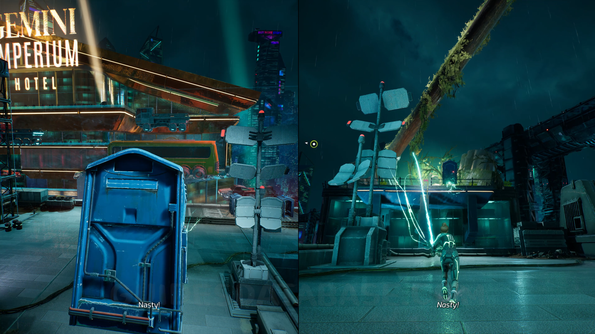 Right after the previous bench, you’ll use your grapple hook to swing from a car and then land on the roof of a building. Player 1 must enter the bathroom while Player 2 picks up the portable toilet. Turn around and throw Player 1 to the entrance of the Side Story so they can kick down the ladder and let you climb up as well.