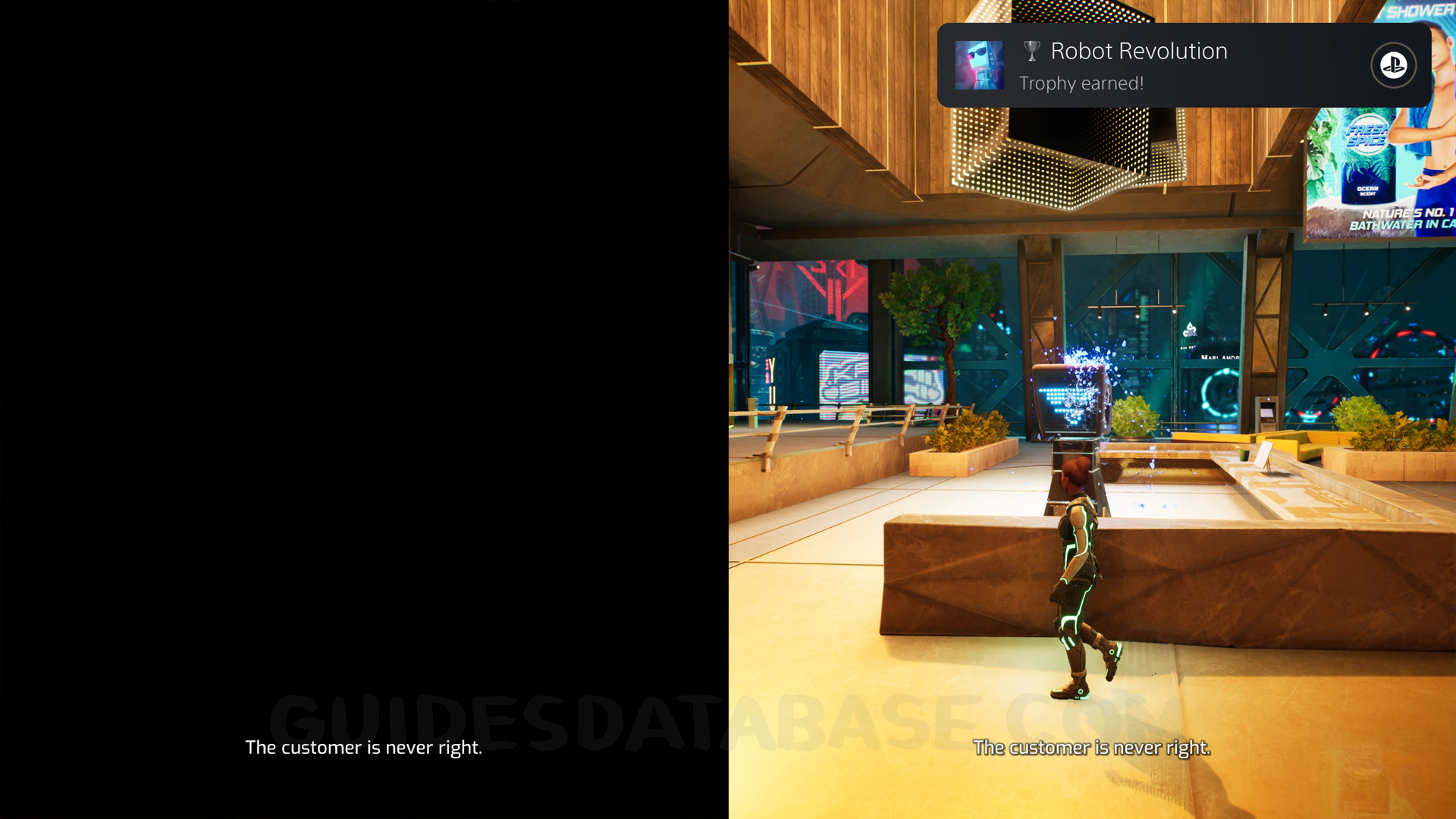 Right after the previous Side Story, you’ll arrive at a hotel with a robot receptionist. Attack the robot until it gets angry and attacks you back.