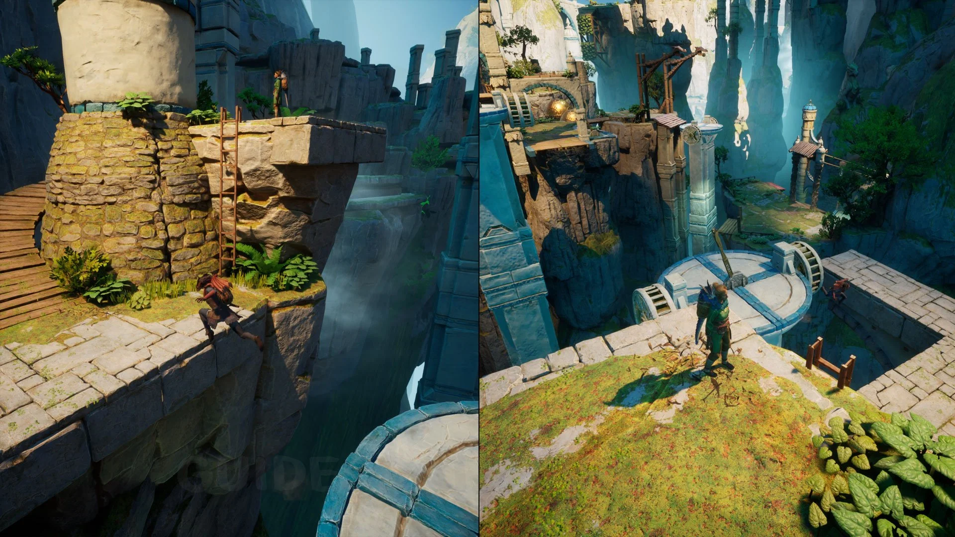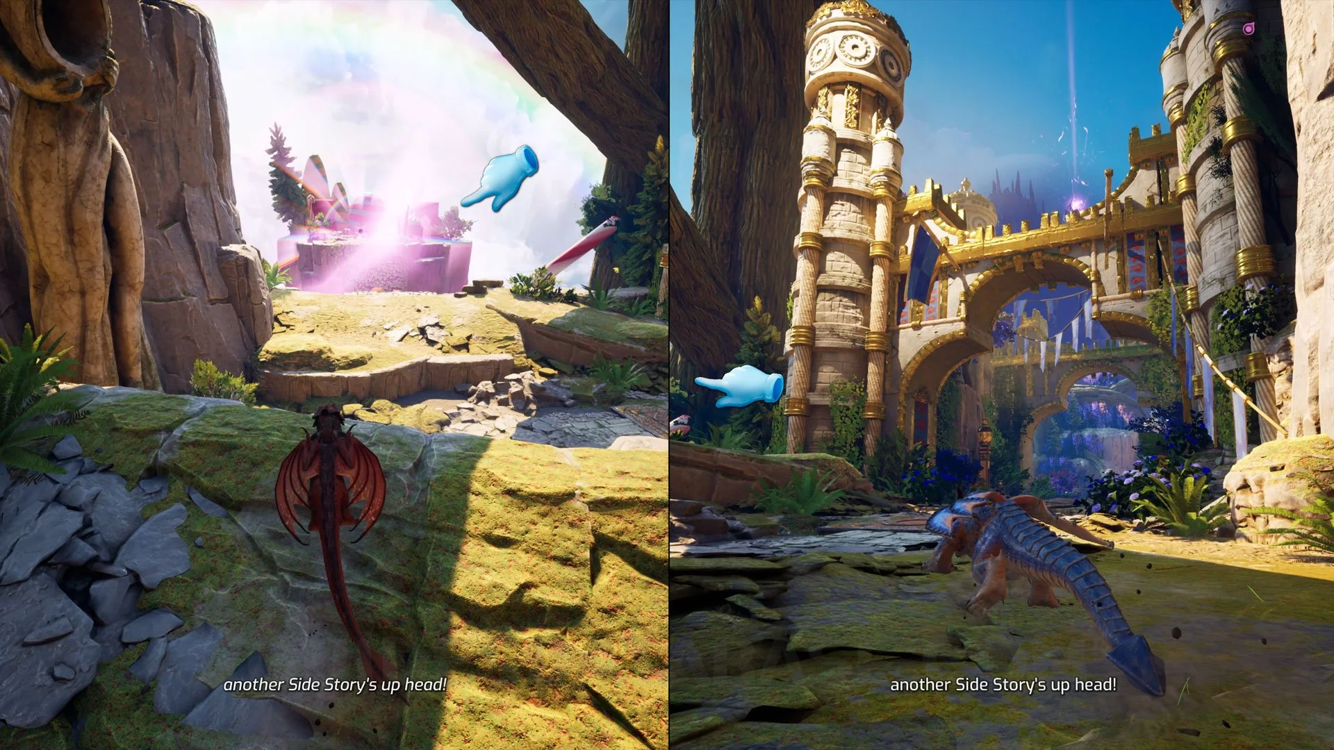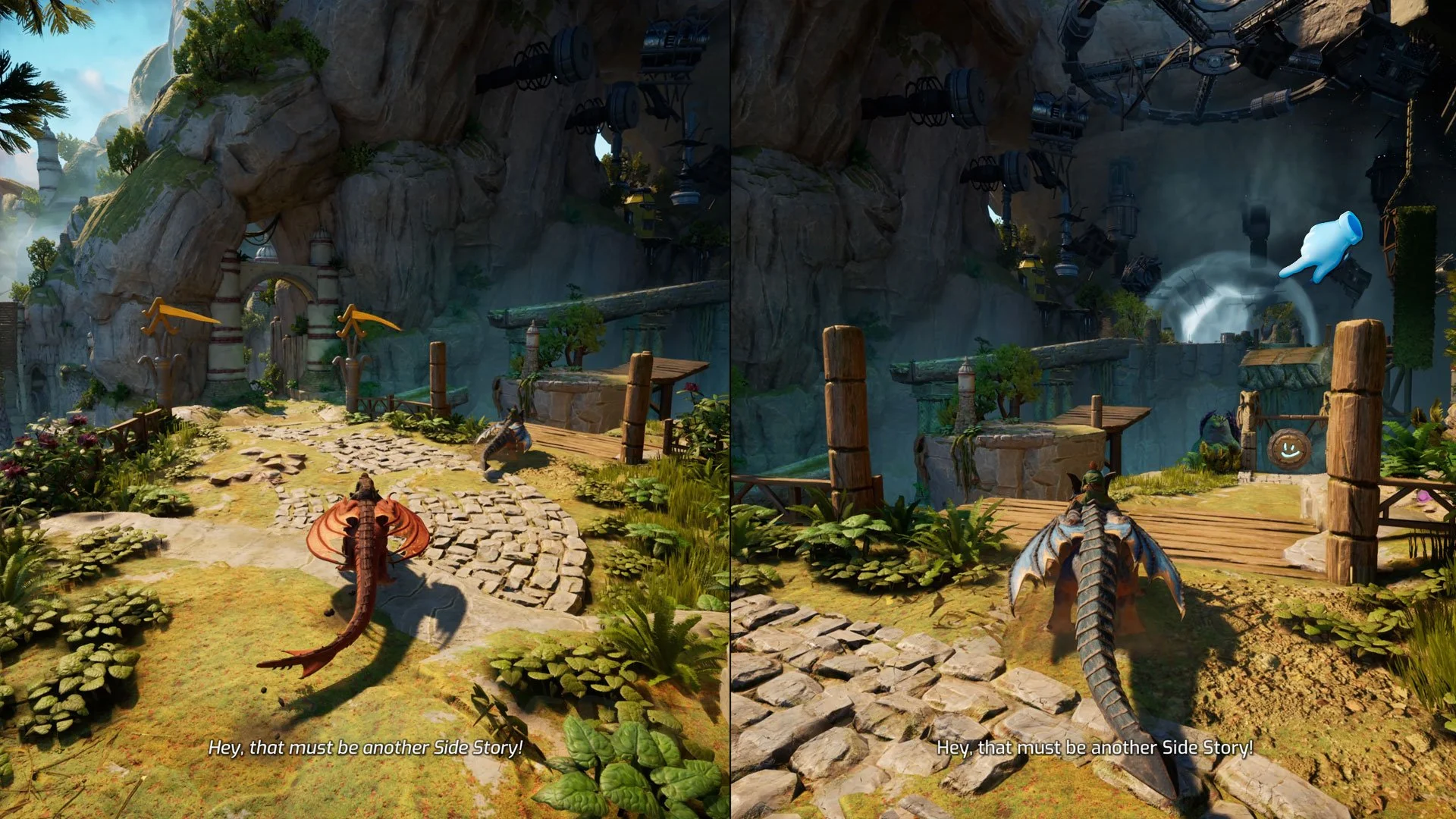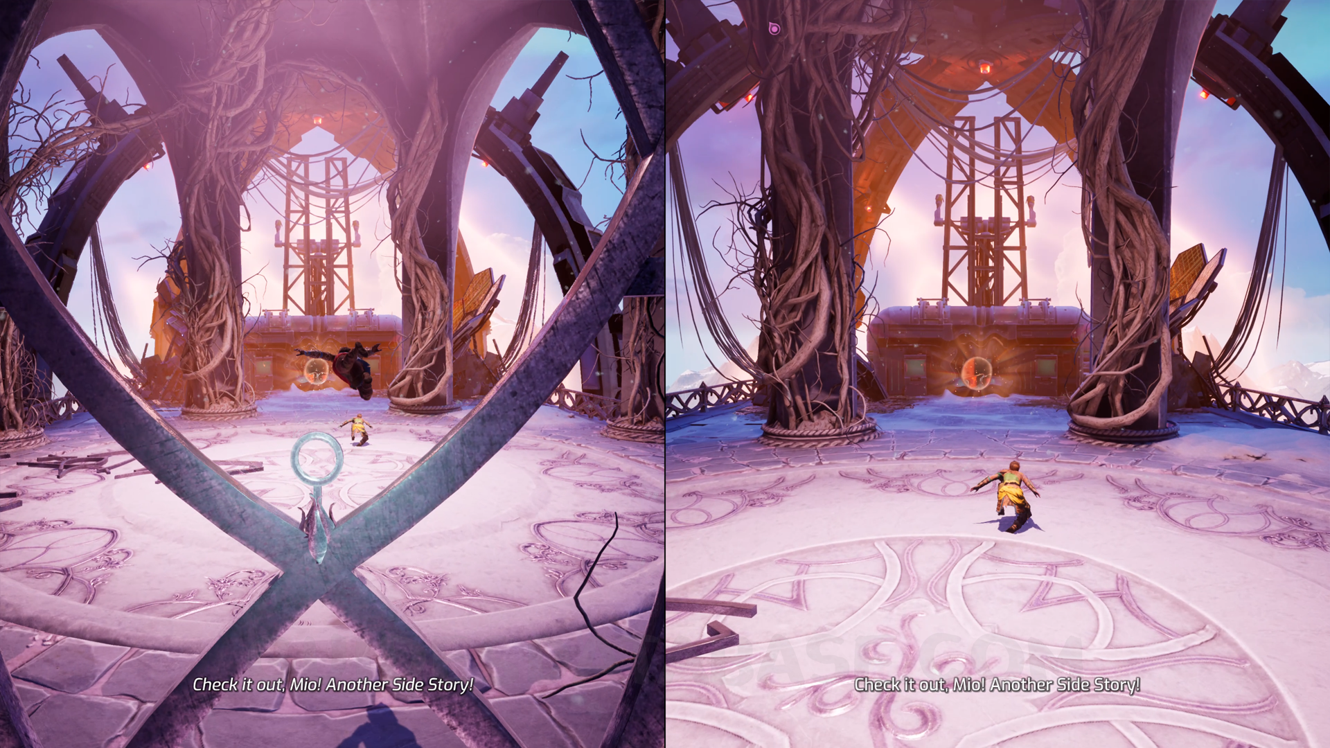 During the mission Water Temple, you’ll see the dragon on the bridge, and next to it you’ll already spot the Side Story area. Continue forward and, instead of going through the golden spheres, go left and pull the lever to be taken to the other side of the area. Then pull the lever again and jump off the platform. Climb the stairs, and you and your friend must pull the two levers to be taken to the Side Story.