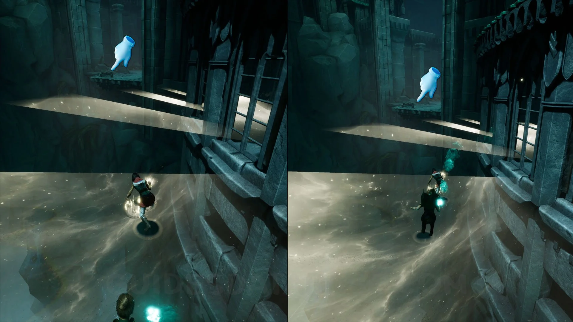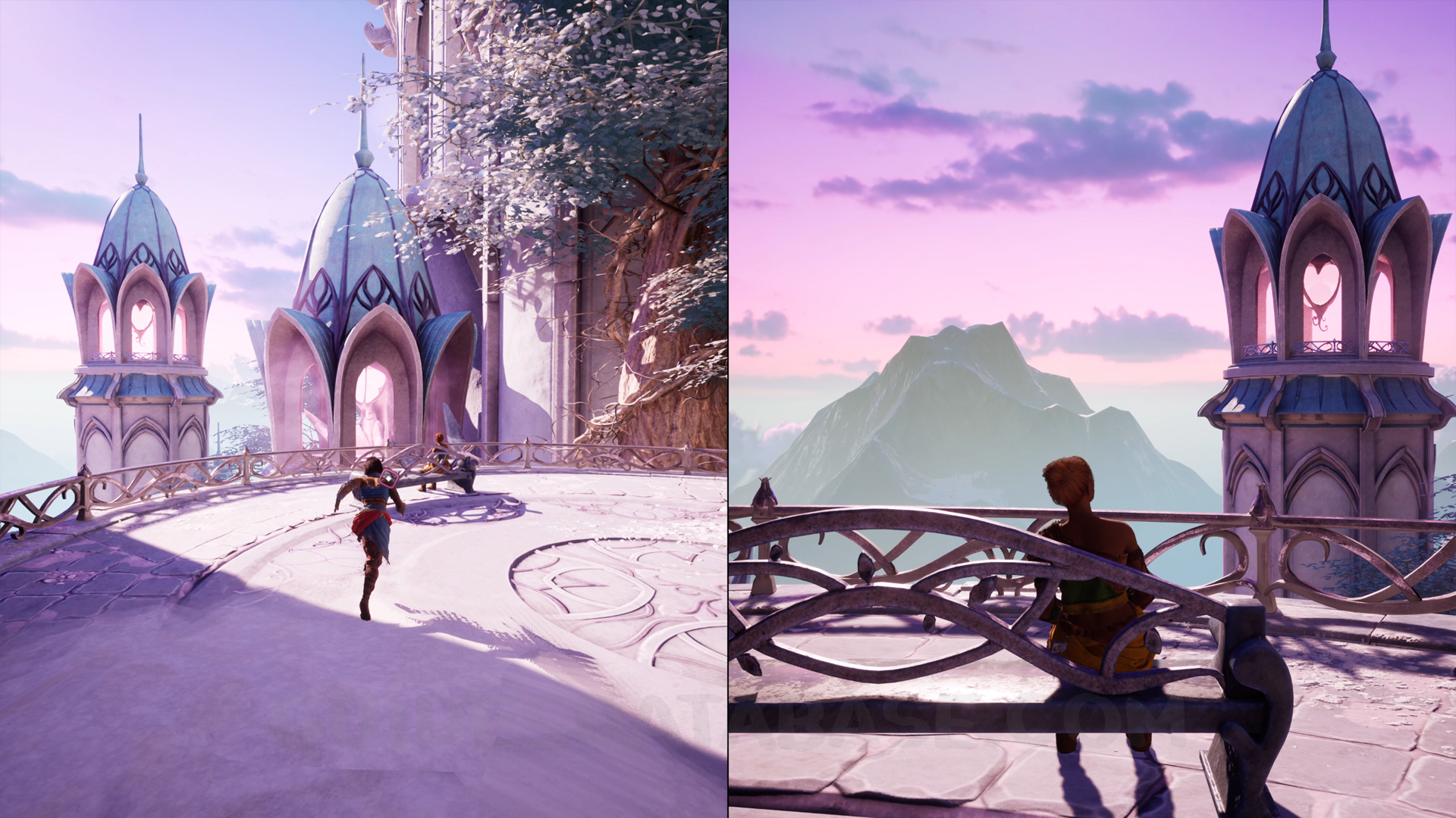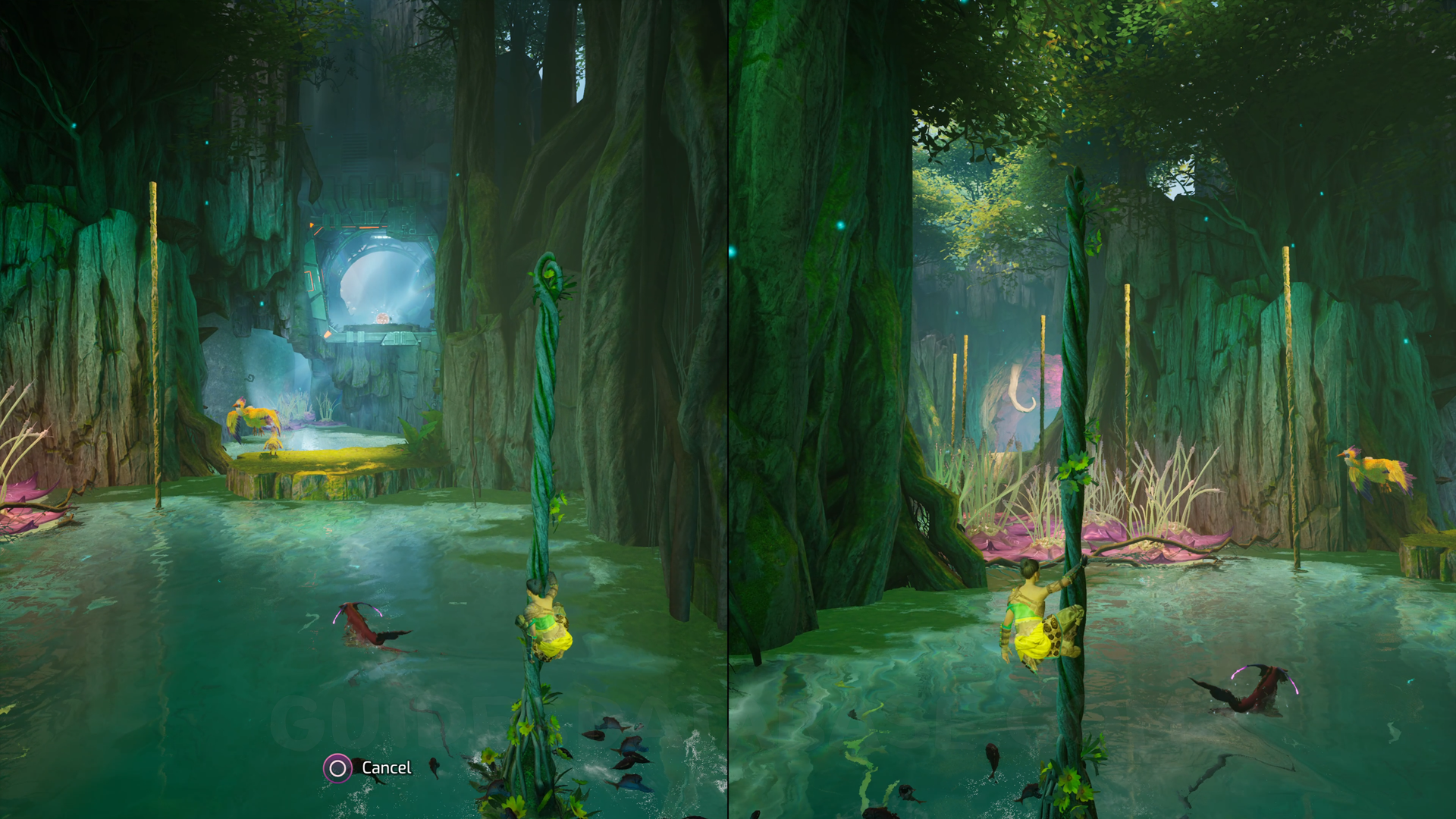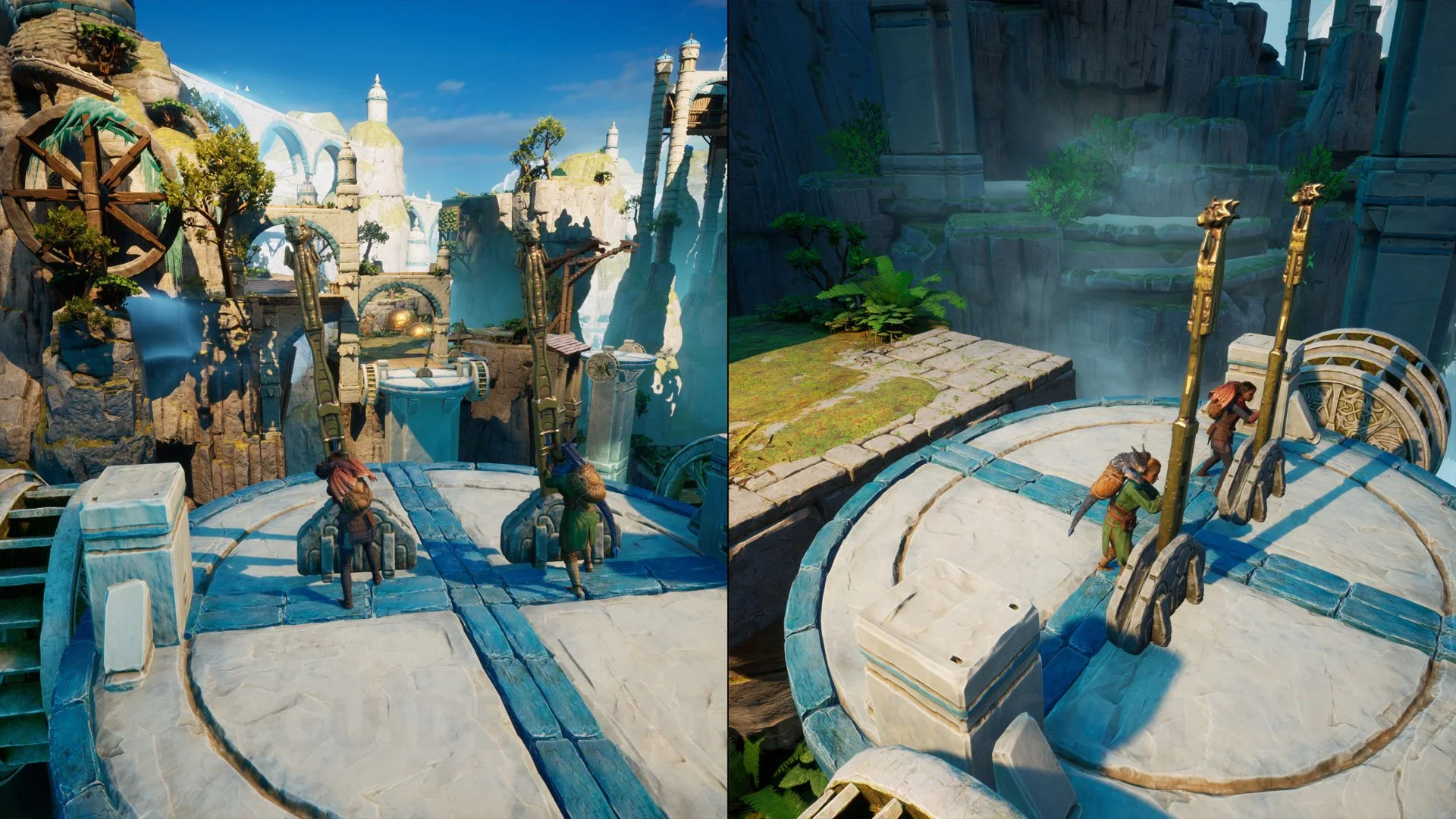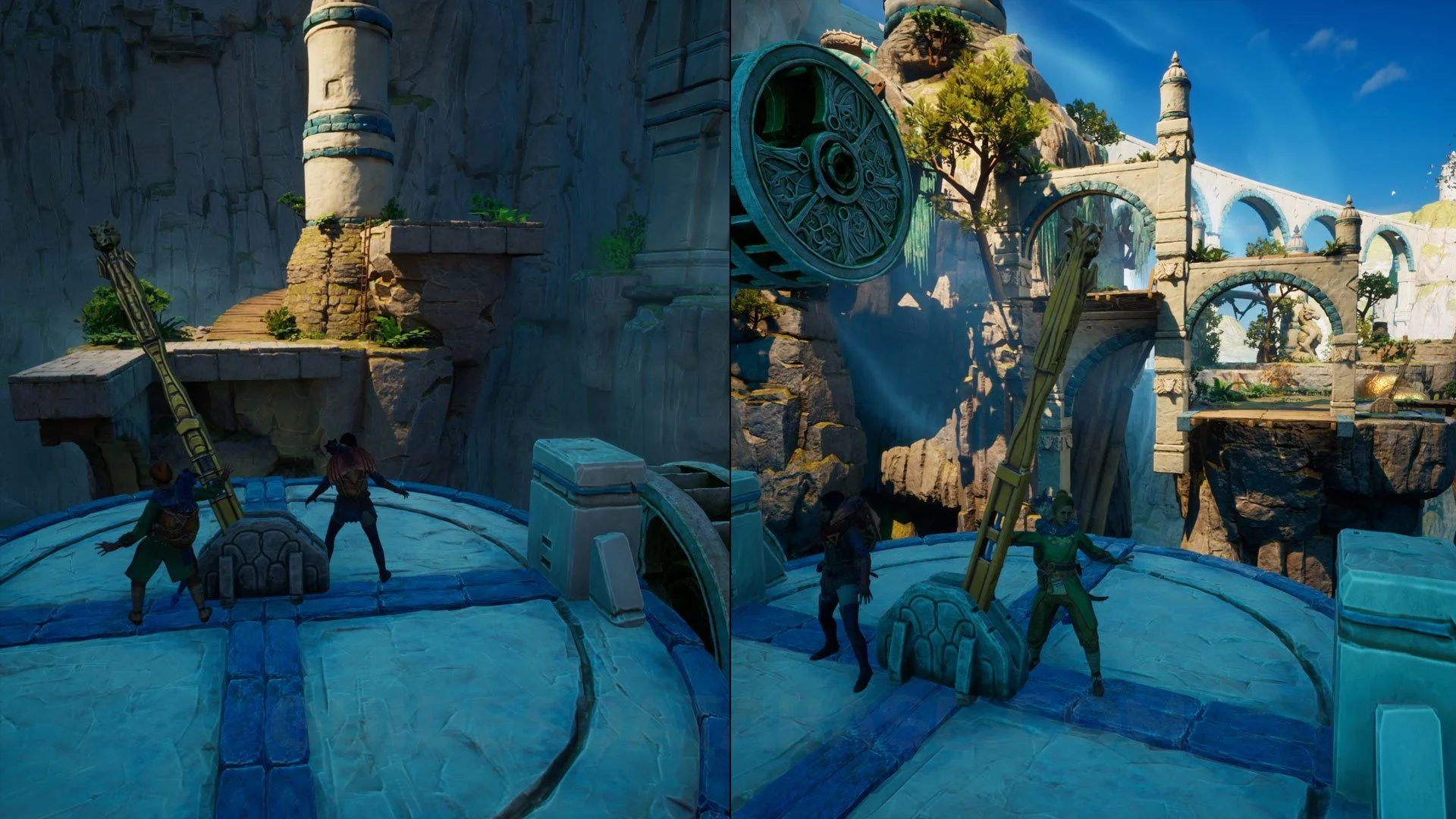 During the mission Water Temple, you’ll see the dragon on the bridge, and next to it you’ll already spot the Side Story area. Continue forward and, instead of going through the golden spheres, go left and pull the lever to be taken to the other side of the area. Then pull the lever again and jump off the platform. Climb the stairs, and you and your friend must pull the two levers to be taken to the Side Story.