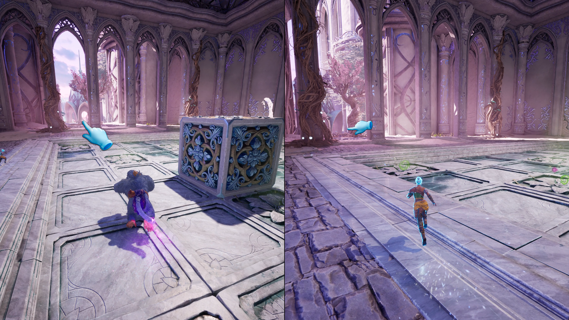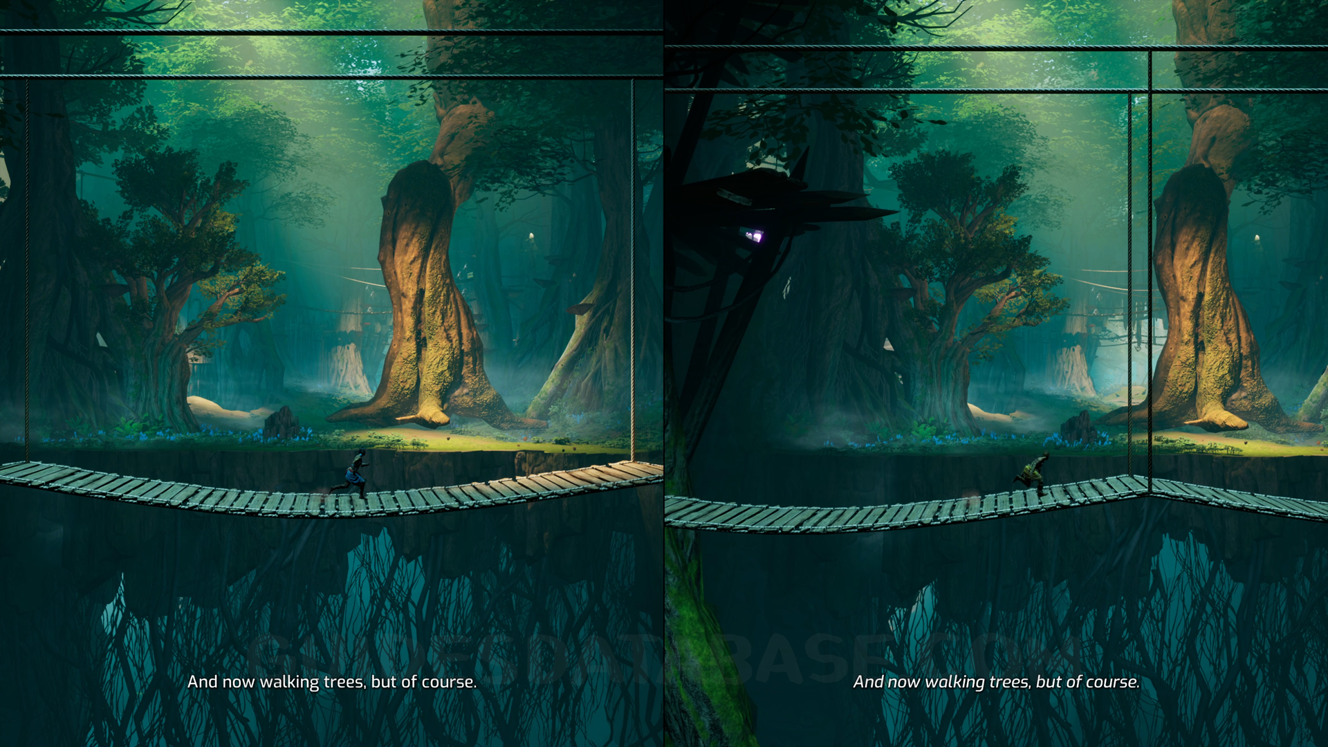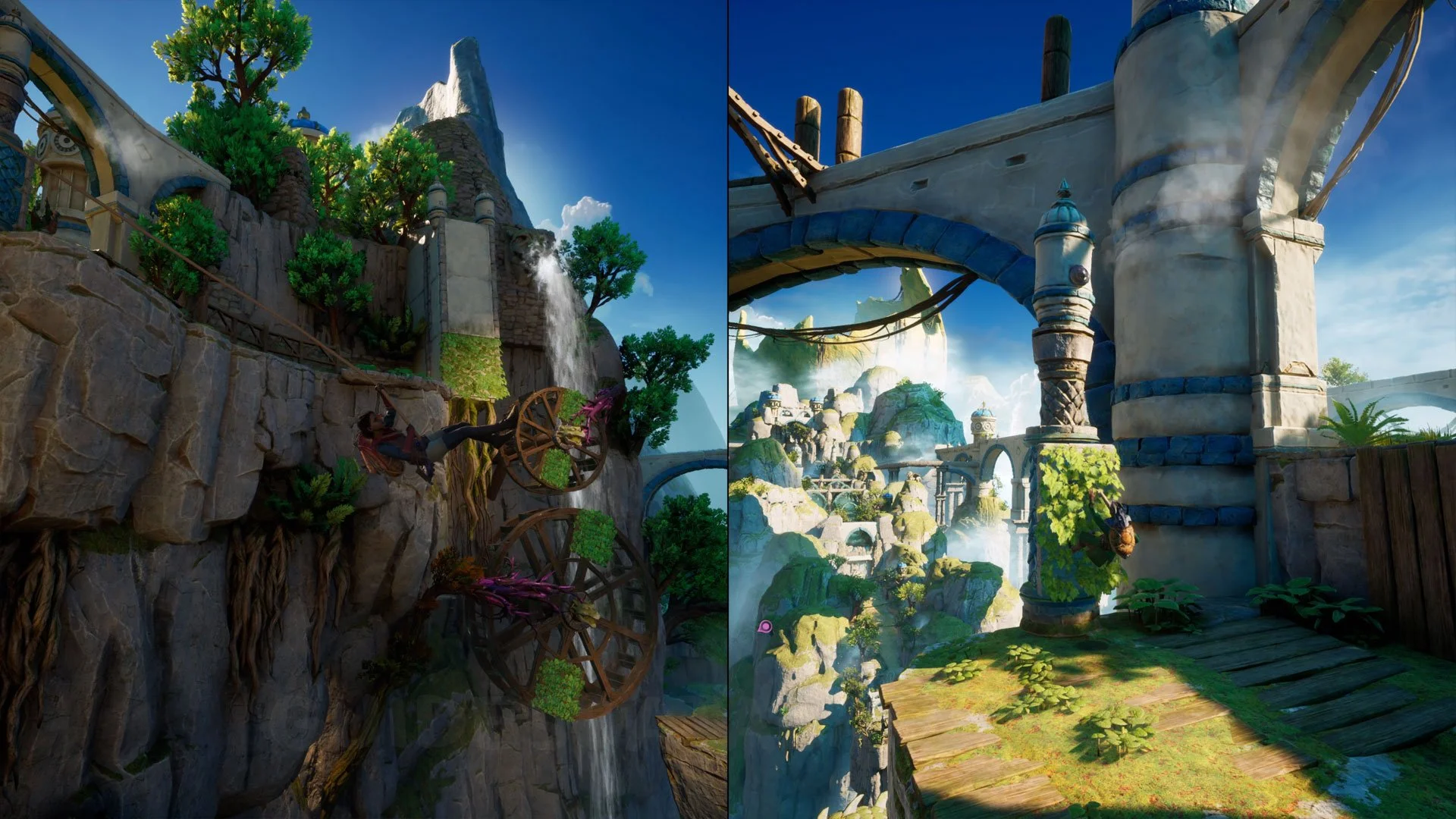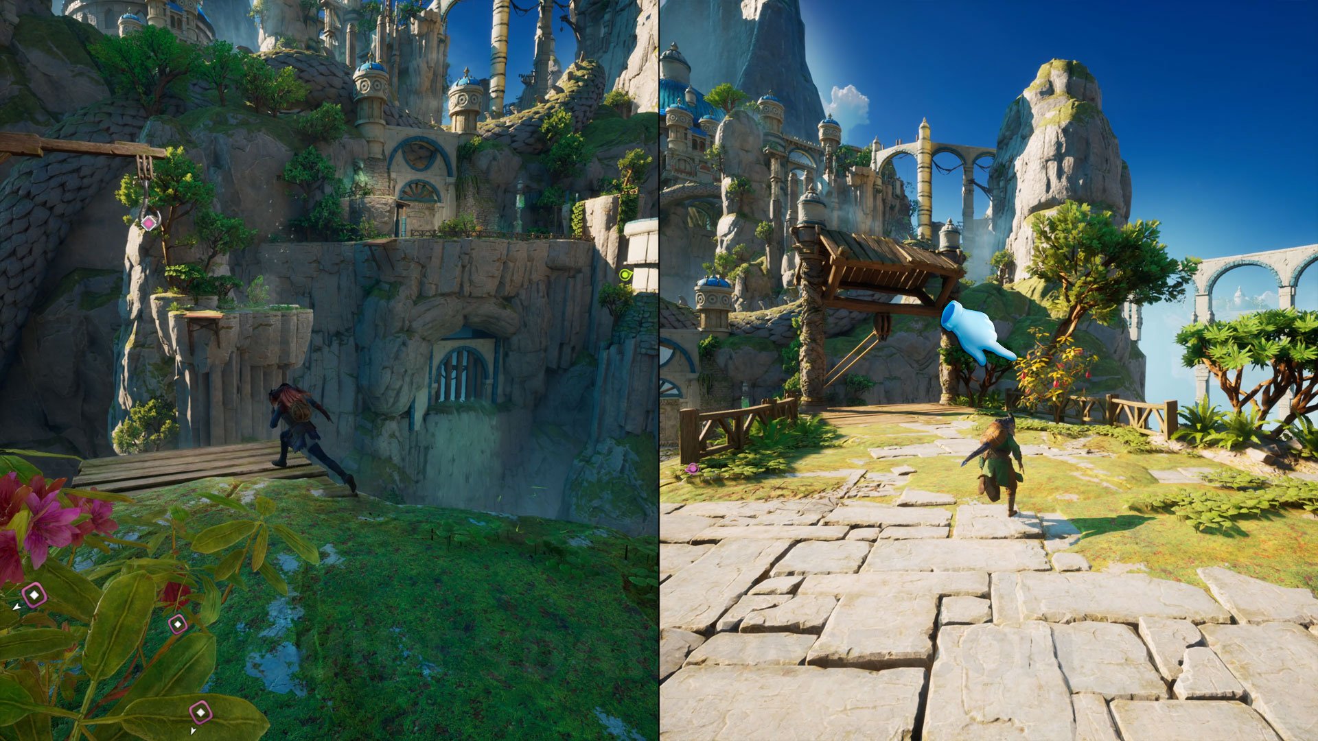During the mission Water Temple, you’ll see the dragon on the bridge, and next to it you’ll already spot the Side Story area. Continue forward and, instead of going through the golden spheres, go left and pull the lever to be taken to the other side of the area. Then pull the lever again and jump off the platform. Climb the stairs, and you and your friend must pull the two levers to be taken to the Side Story.