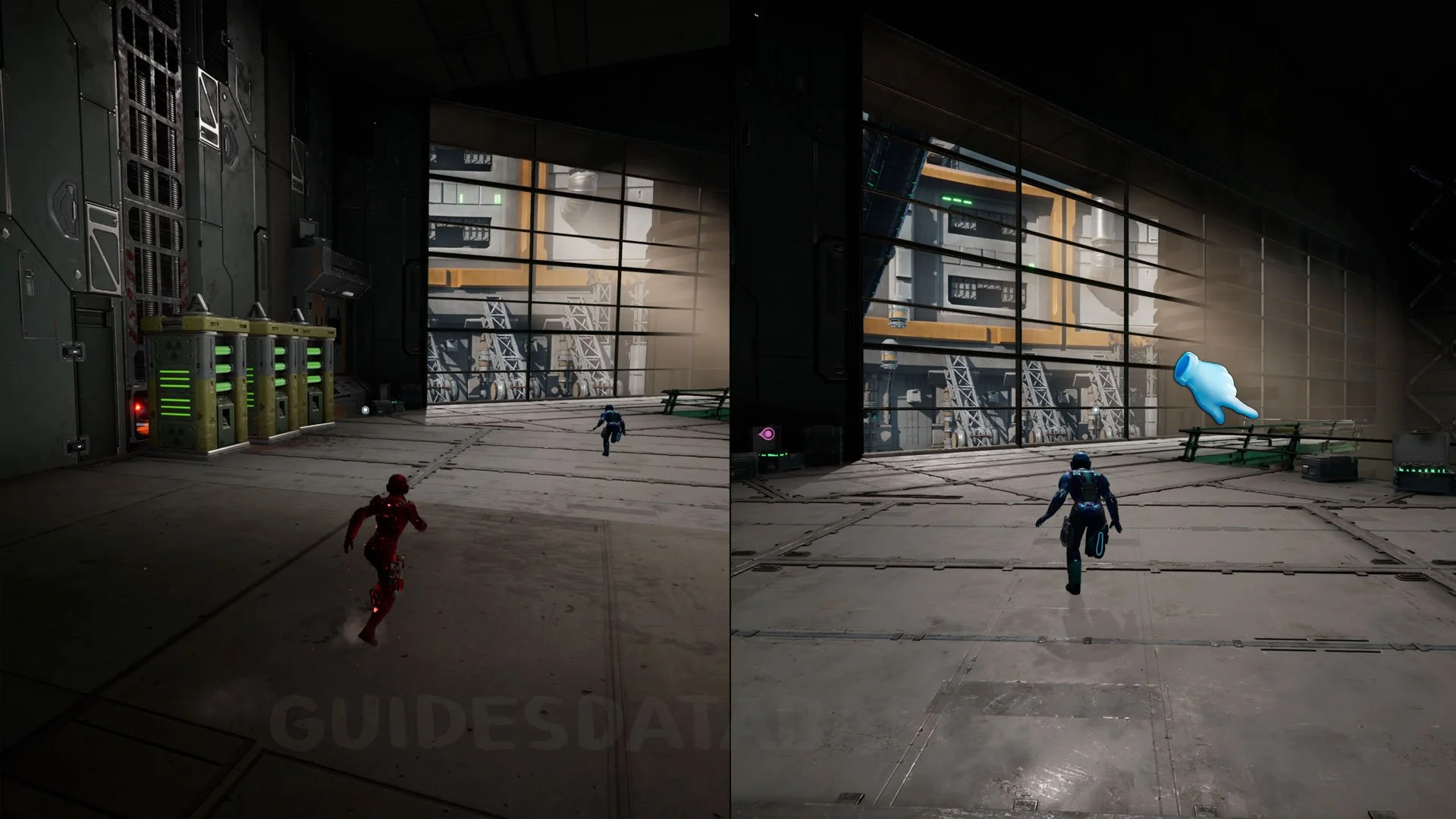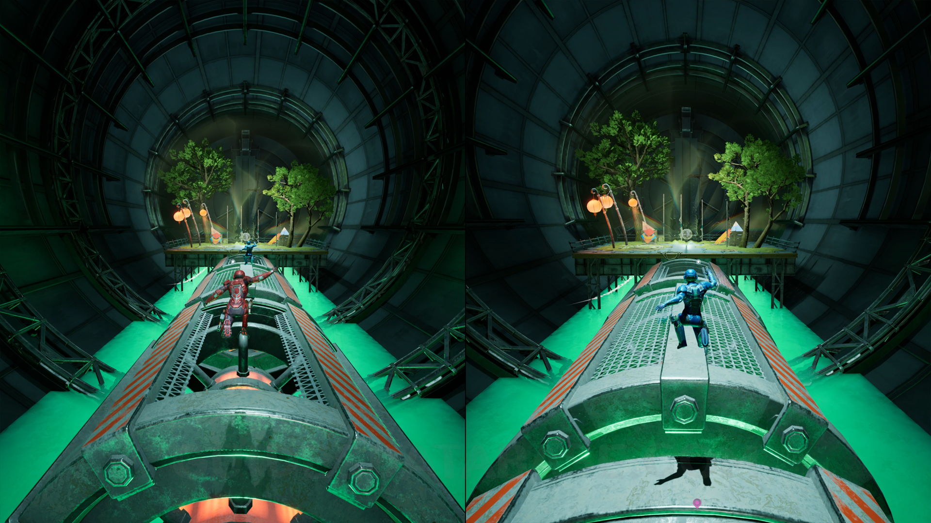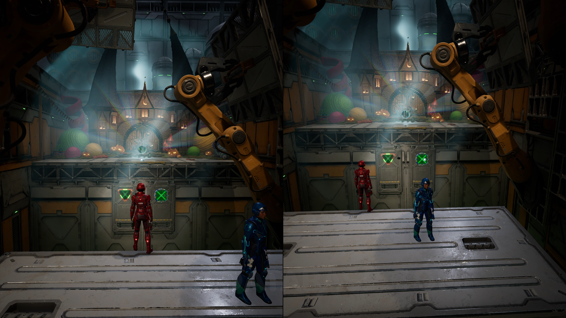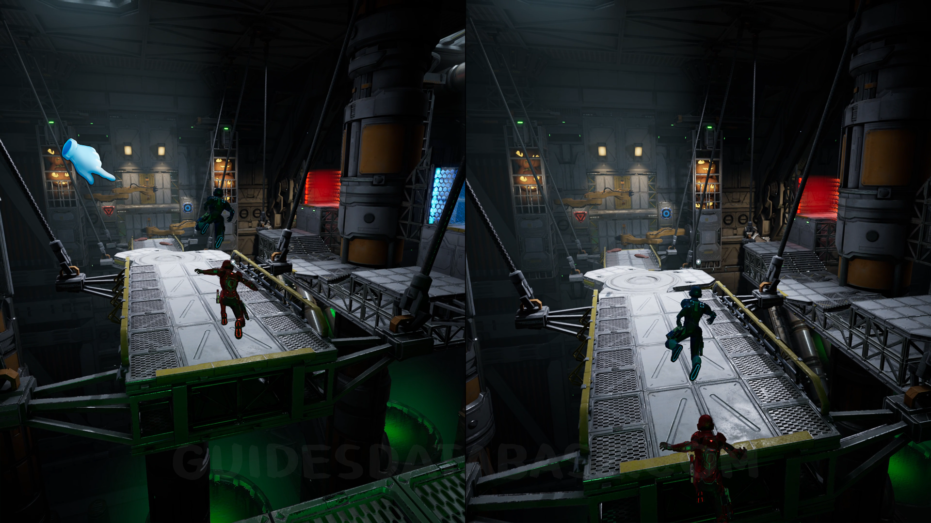 During the mission Test Chamber, you’ll see a red barrier that only Player 1 can pass through and a blue barrier that only Player 2 can pass through. Instead of going through the barriers, continue straight ahead and activate the gate that leads to the Side Story.