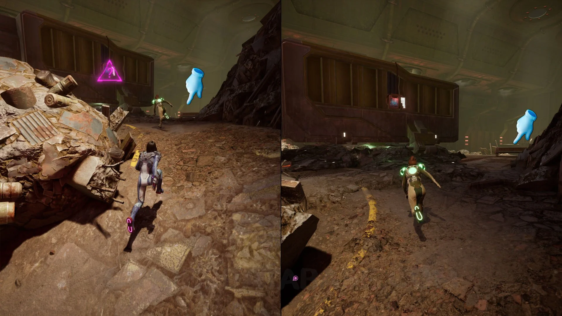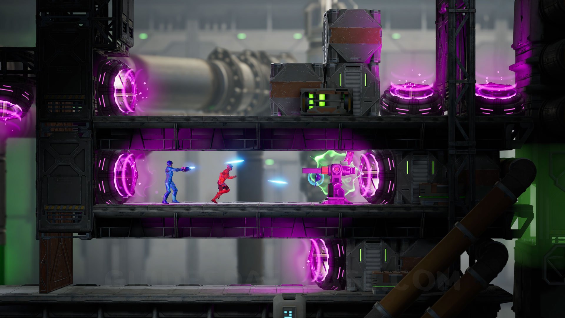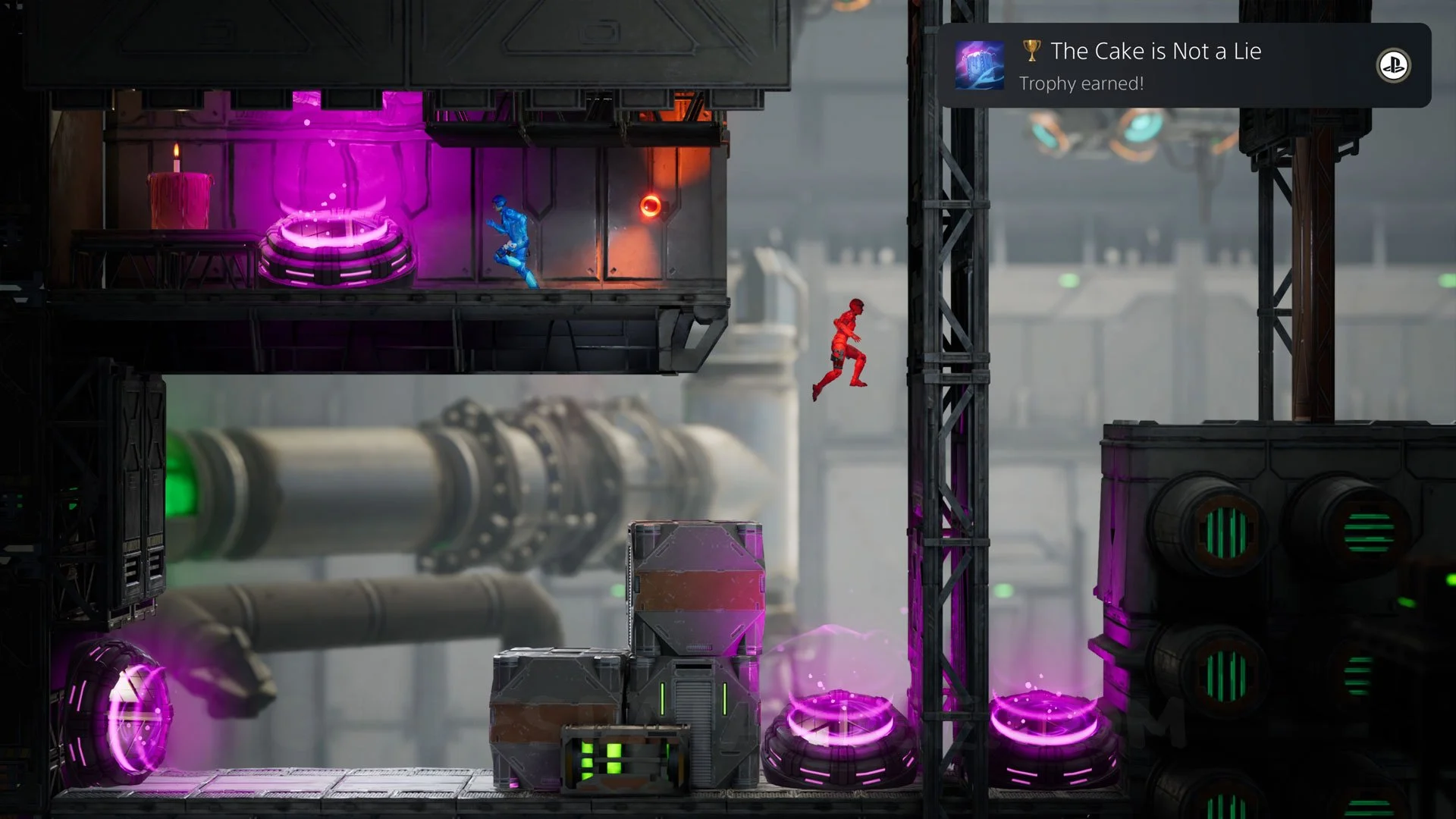 During the mission Test Chamber, you’ll see a red barrier that only Player 1 can pass through and a blue barrier that only Player 2 can pass through. Instead of going through the barriers, continue straight ahead and activate the gate that leads to the Side Story.