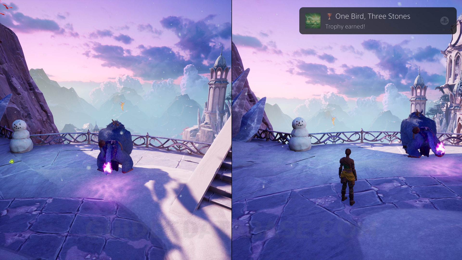 During the mission Halls of Ice, before entering the castle, go to the left and you’ll see a snowman and three snowballs. Player 1 must throw the three snowballs, and the last one will hit a bird. The order you throw them in doesn’t matter.