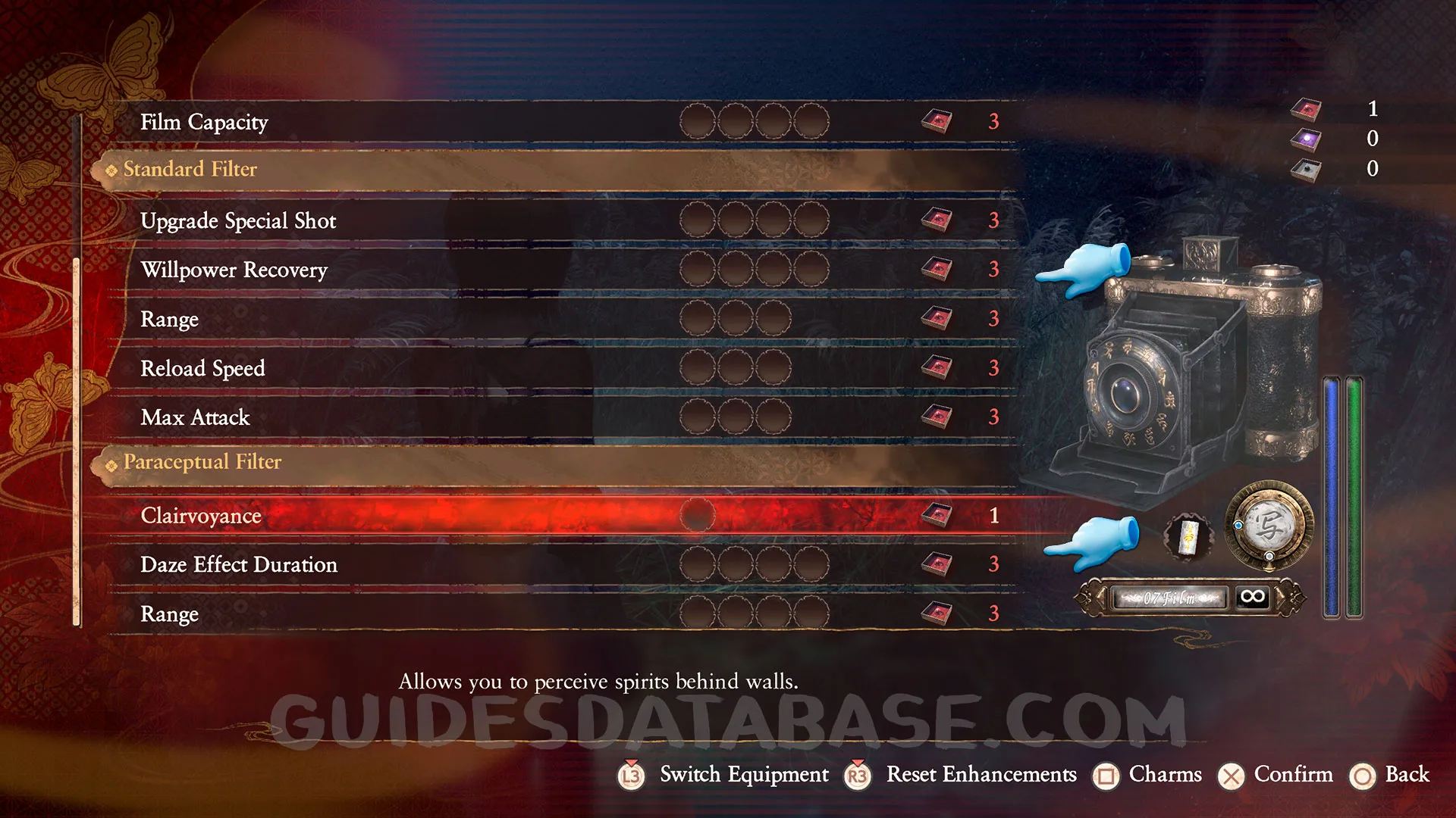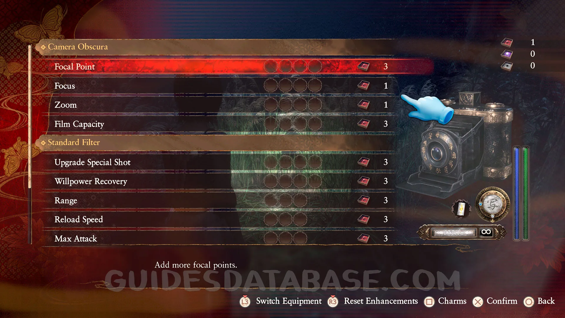 You need to use Reversion Beads to remove all the upgrades used to enhance the Camera Obscura. There are a few throughout the game. I will show the location of one in Chapter 3 in the Kurosawa House Hallway. You can use it in the Camera Obscura upgrade menu by pressing Square.