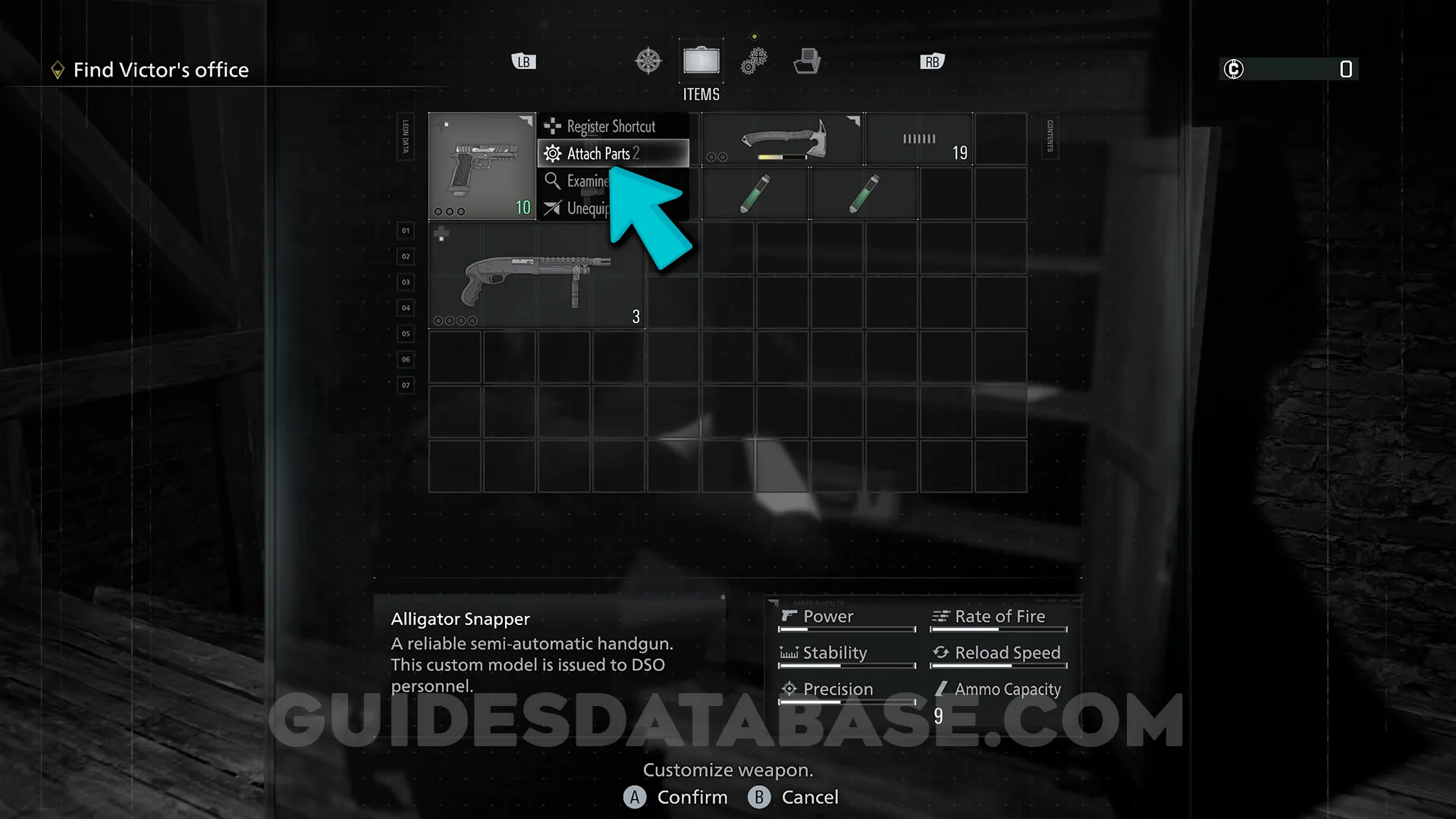 You can upgrade a weapon for the first time in the corridor after the Attic Room. Break the cabinet to obtain the Compensator, attach it to your handgun, and you can also upgrade weapons later at the Supply Box.