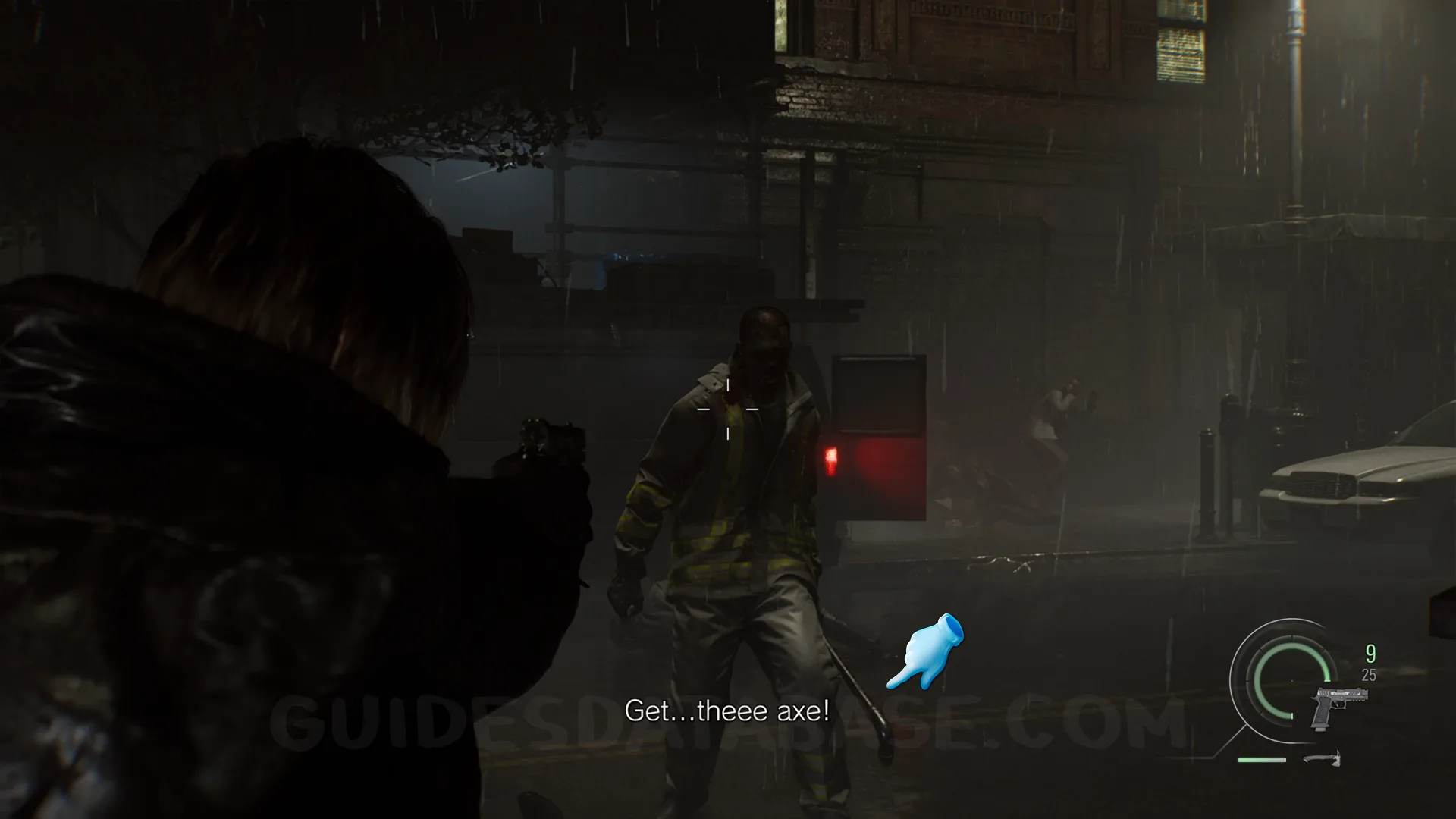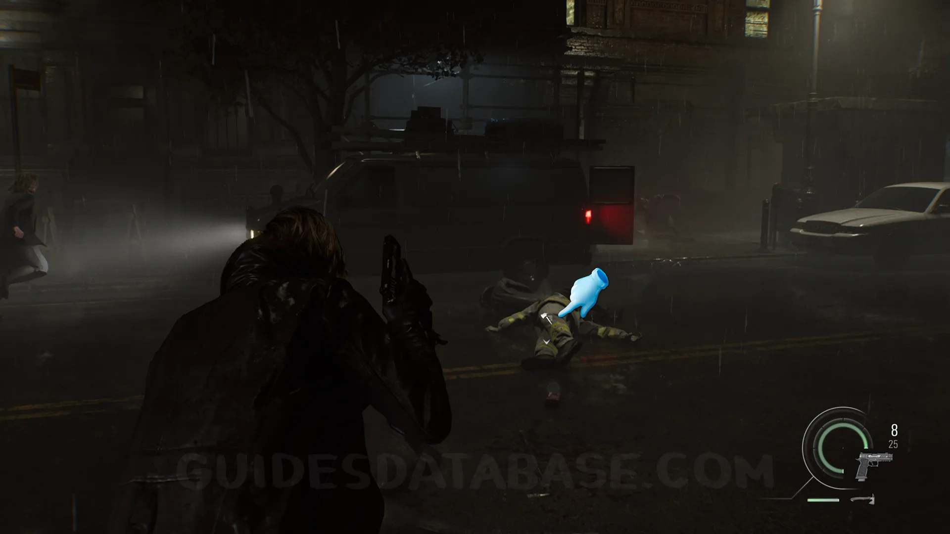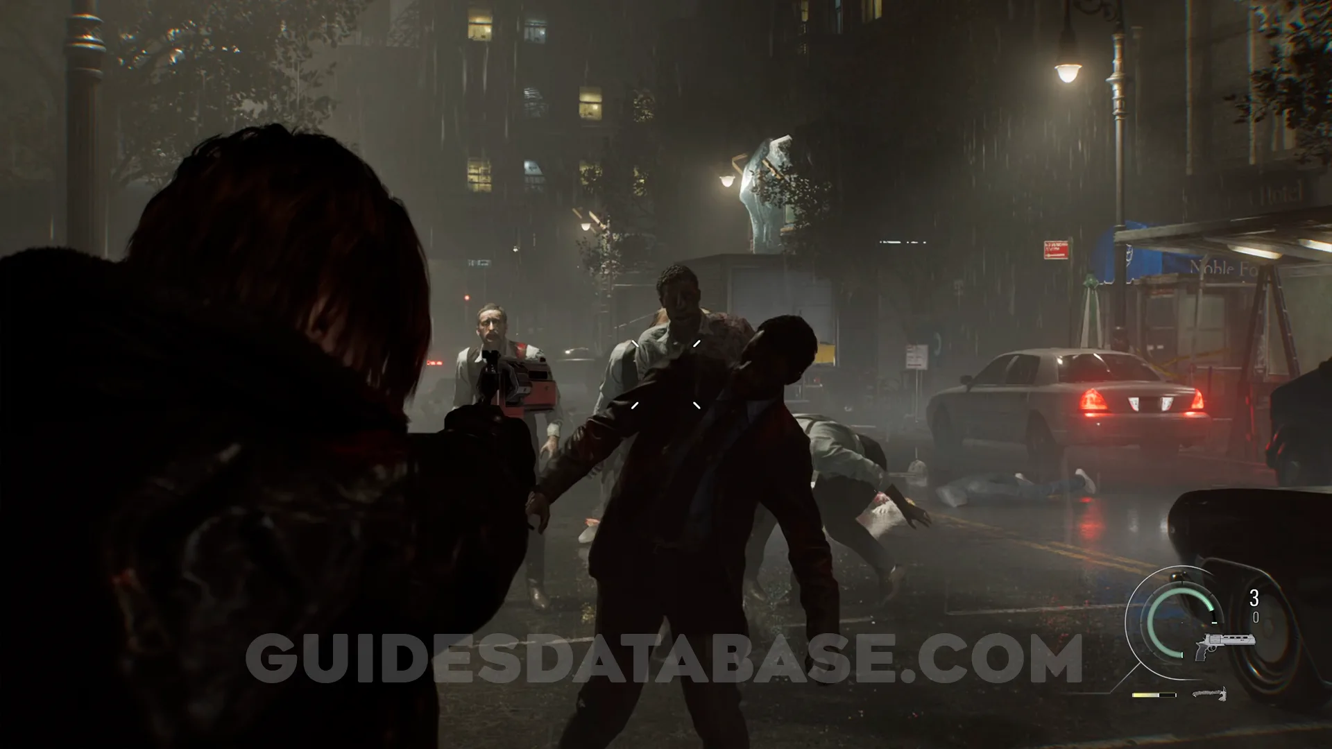 You can obtain this as either Leon or Grace. The first time you play as Leon, there will be several Zombies on the street. Wait for 3 of them to align and fire a Requiem shot.