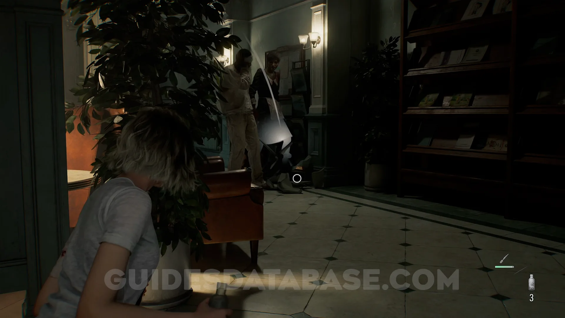 After this, go to the Examination Room and break the vase to lure the 2 Zombies. Throw the empty bottle at the female Zombie so the other blind Zombie will hit her.
